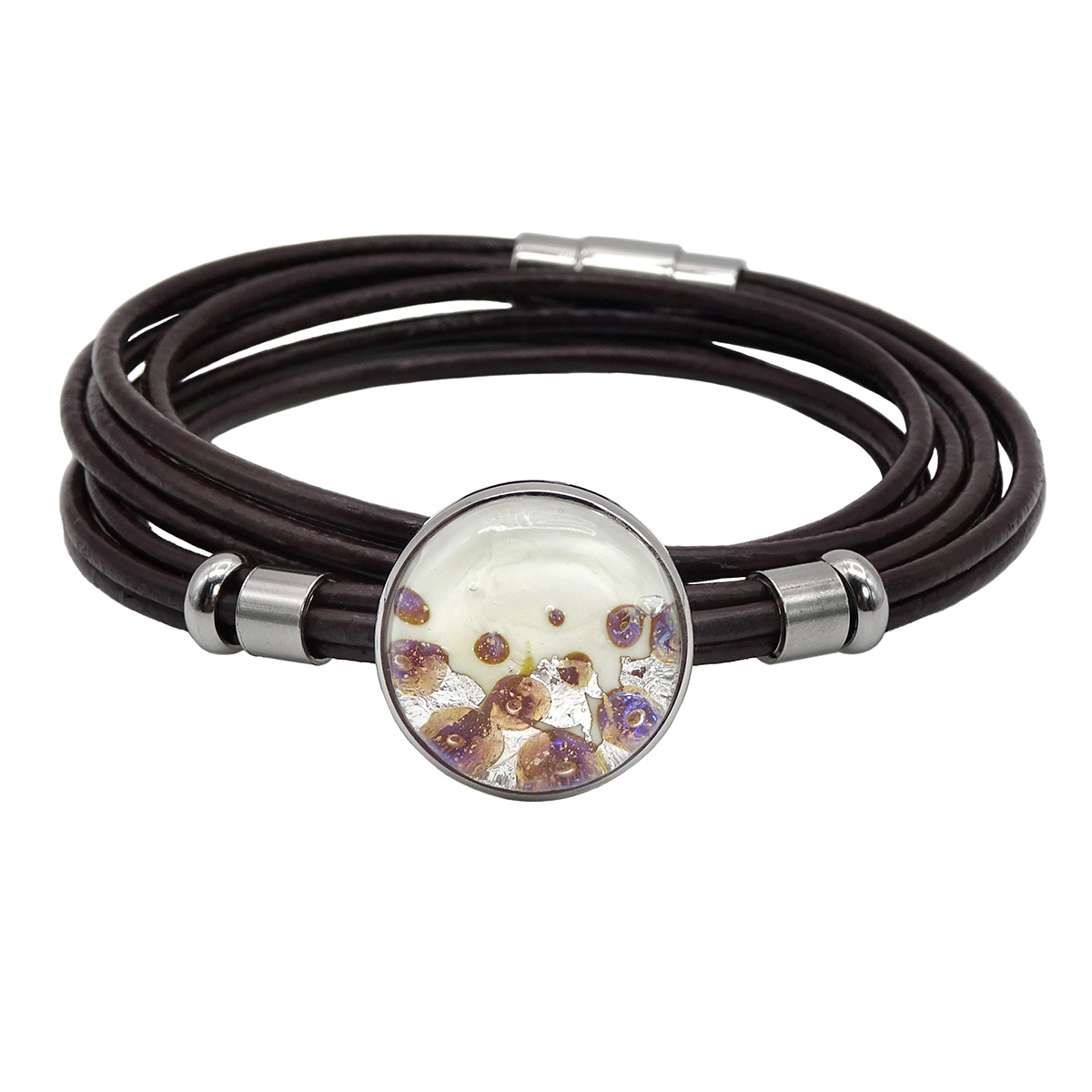 Браслет изготовлен из муранского стекла, натуральной кожи и гипоаллергенной ювелирной стали, что очень важно для людей с чувствительной кожей. Металл не темнеет и не подвергается воздействиям окружающей среды, надолго обеспечивая красивый внешний вид изделия. Крепкий магнитный замок надежно фиксируется на запястье. Ширина браслета - 1 см. Диаметр стеклянного элемента - 2 см. Вес - 17 гр.
