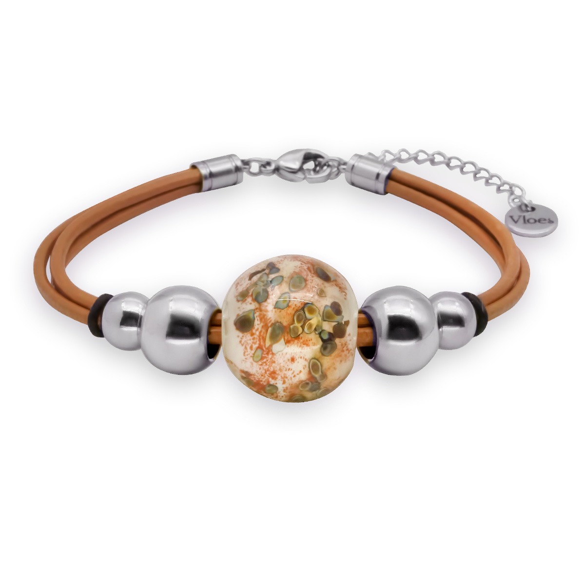Браслет изготовлен из муранского стекла, натуральной кожи и гипоаллергенной ювелирной стали, что очень важно для людей с чувствительной кожей. Металл не темнеет и не подвергается воздействиям окружающей среды, надолго обеспечивая красивый внешний вид изделия. Застежка - карабин надежно фиксируется на запястье.  Ширина браслета - 0,5 см. Диаметр стеклянного шара 1,8 см. Вес - 27 гр.