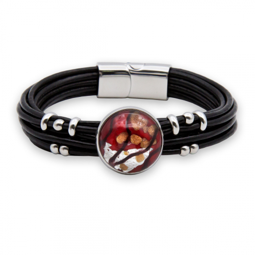 Браслет изготовлен из муранского стекла, натуральной кожи и гипоаллергенной ювелирной стали, что очень важно для людей с чувствительной кожей. Металл не темнеет и не подвергается воздействиям окружающей среды, надолго обеспечивая красивый внешний вид изделия. Крепкий магнитный замок с двойной защитой надежно фиксируется на запястье. Ширина браслета - 1,5 см. Диаметр стеклянного элемента - 2 см. Вес - 24 гр.