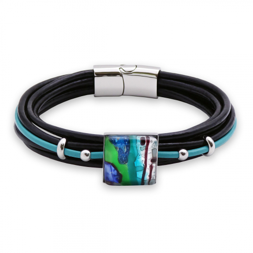 Браслет изготовлен из муранского стекла, натуральной кожи и гипоаллергенной ювелирной стали, что очень важно для людей с чувствительной кожей. Металл не темнеет и не подвергается воздействиям окружающей среды, надолго обеспечивая красивый внешний вид изделия. Крепкий магнитный замок с двойной защитой надежно фиксируется на запястье. Ширина браслета - 1,5 см. Диаметр стеклянного элемента - 2 см. Вес - 24 гр.