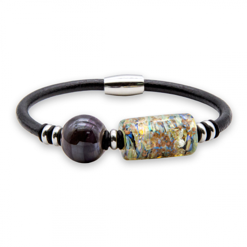 Браслет изготовлен из муранского стекла, натуральной кожи и гипоаллергенной ювелирной стали, что очень важно для людей с чувствительной кожей. Металл не темнеет и не подвергается воздействиям окружающей среды, надолго обеспечивая красивый внешний вид изделия. Крепкий магнитный замок с двойной защитой надежно фиксируется на запястье. Ширина браслета - 0,5 см. Размер стеклянной бусины - 1,3x2,2 см. Вес - 12 гр.