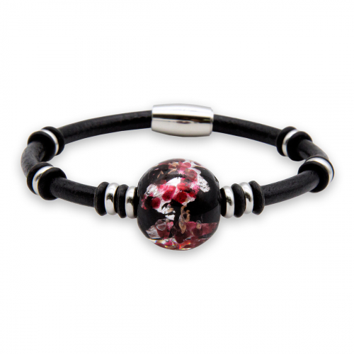 Браслет изготовлен из муранского стекла, натуральной кожи и гипоаллергенной ювелирной стали, что очень важно для людей с чувствительной кожей. Металл не темнеет и не подвергается воздействиям окружающей среды, надолго обеспечивая красивый внешний вид изделия. Крепкий магнитный замок надежно фиксируется на запястье. Ширина браслета - 1 см. Диаметр стеклянных шариков - 1,2 см. Вес - 15 гр.