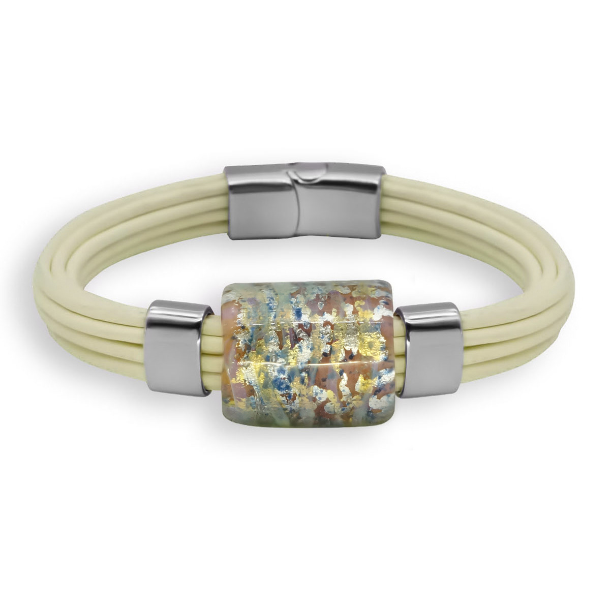 Браслет изготовлен из муранского стекла, натуральной кожи и гипоаллергенной ювелирной стали, что очень важно для людей с чувствительной кожей. Металл не темнеет и не подвергается воздействиям окружающей среды, надолго обеспечивая красивый внешний вид изделия. Крепкий магнитный замок с двойной защитой надежно фиксируется на запястье. Ширина браслета - 1,5 см. Размер стеклянной бусины - 1,9*2,5 см. Вес - 29 гр.
