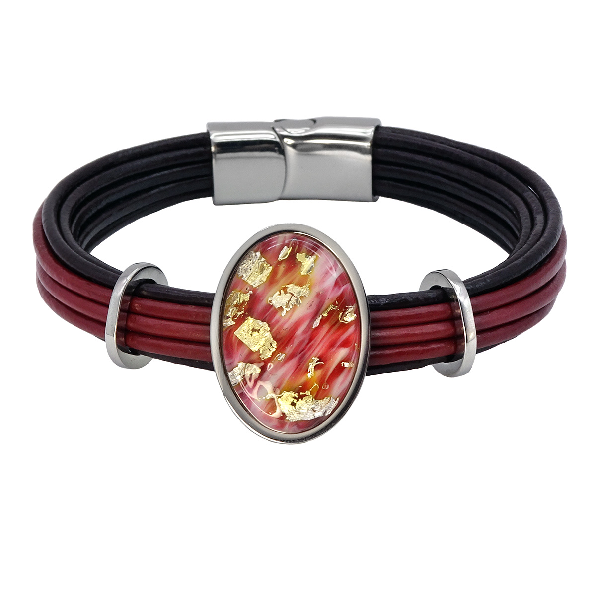 Браслет изготовлен из муранского стекла, натуральной кожи и гипоаллергенной ювелирной стали, что очень важно для людей с чувствительной кожей. Металл не темнеет и не подвергается воздействиям окружающей среды, надолго обеспечивая красивый внешний вид изделия. Крепкий магнитный замок с двойной защитой надежно фиксируется на запястье. Ширина браслета - 1,5 см. Размер стеклянного элемента - 1,9x2,6 см. Вес - 23 гр.