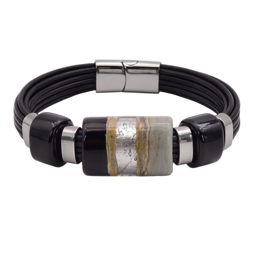 Браслет изготовлен из муранского стекла, натуральной кожи и гипоаллергенной ювелирной стали, что очень важно для людей с чувствительной кожей. Металл не темнеет и не подвергается воздействиям окружающей среды, надолго обеспечивая красивый внешний вид изделия. Крепкий магнитный замок с двойной защитой надежно фиксируется на запястье. Ширина браслета - 1,5 см. Размер стеклянного элемента - 1х5 см. Вес -  гр.