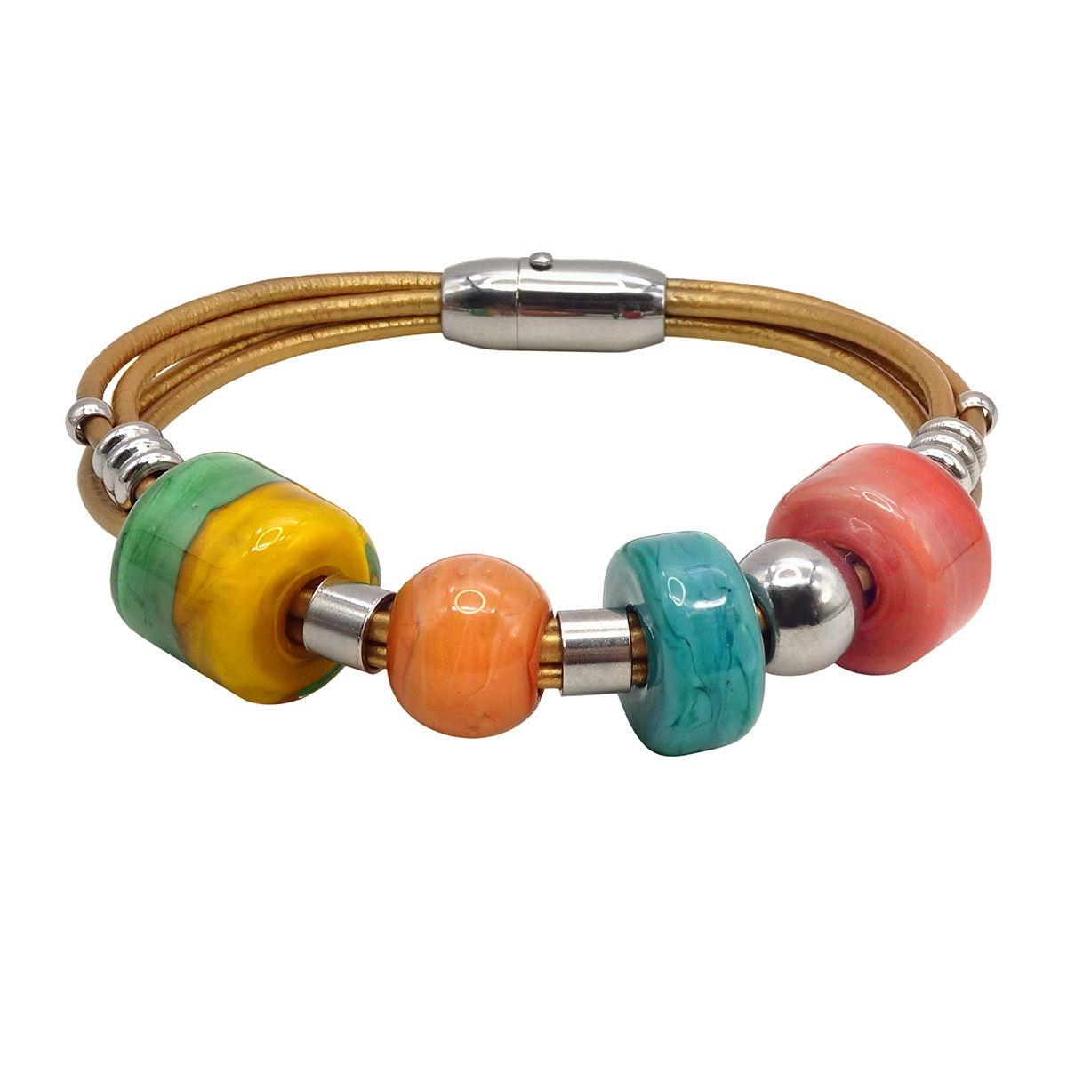 Браслет изготовлен из муранского стекла, натуральной кожи и гипоаллергенной ювелирной стали, что очень важно для людей с чувствительной кожей. Металл не темнеет и не подвергается воздействиям окружающей среды, надолго обеспечивая красивый внешний вид изделия. Размер стеклянных элементов - 1,4*1,5, 0,7*1,5, 1*1,5 см. Диаметр стеклянного шара - 1,2 см. Вес - 27 гр.