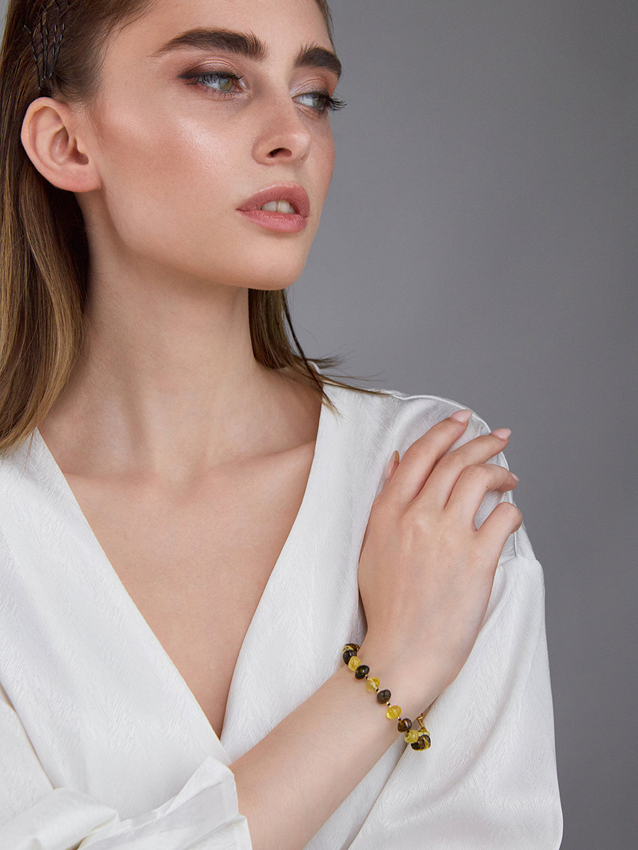 Браслет из натурального янтаря «Галька лимонная и зелёная»