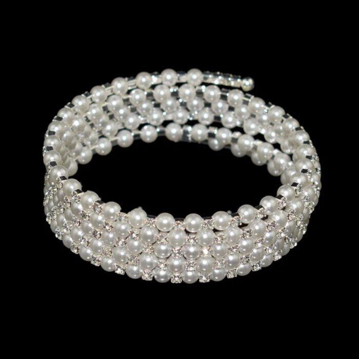 Браслет с жемчугом и стразами на руку широкий многослойный, цвет: серебристый, вставка: иск.жемчуг и стразы, арт.001.912