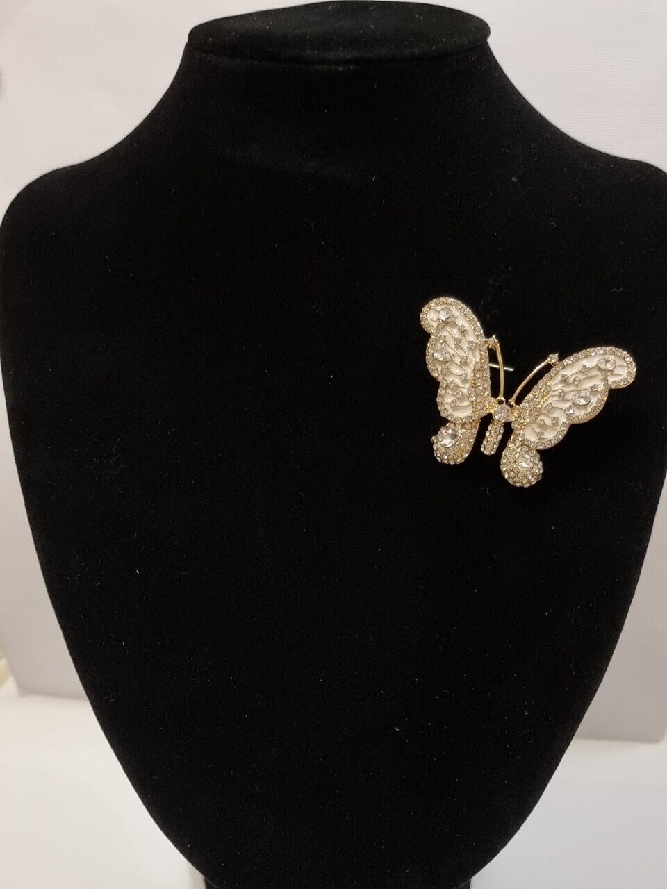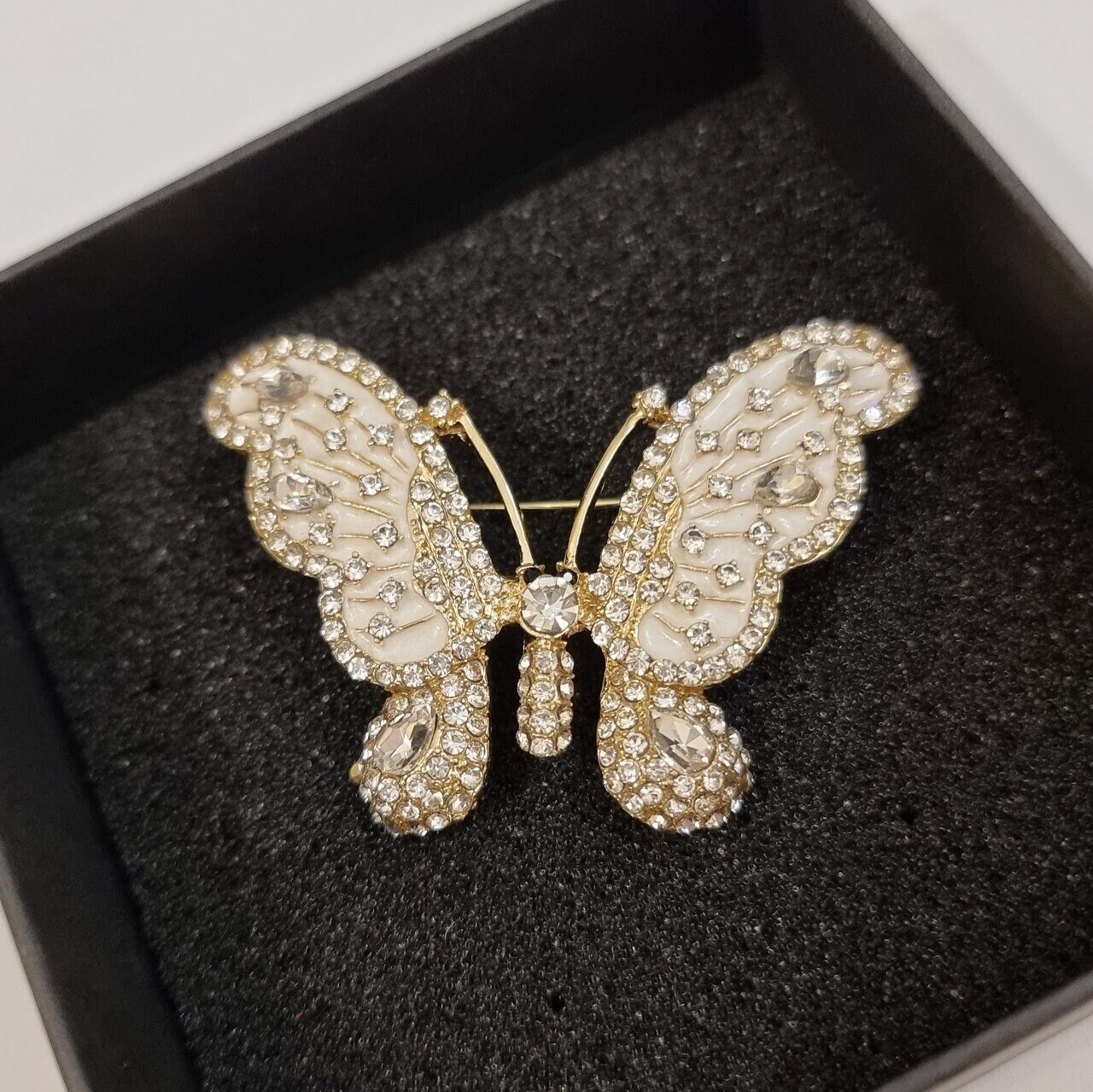Брошь Бабочка с прозрачными стразами и белой эмалью в позолоте, арт.748.315
