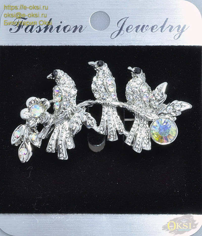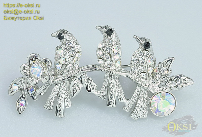Стильная брошь '' Птички на ветке '' украшена сверкающими кристаллами. Птички сидящие на ветке символизируют свободу, радость и счастье. Качественное родиевое покрытие серебряного цвета. Размер 5,5 см х 3см.
