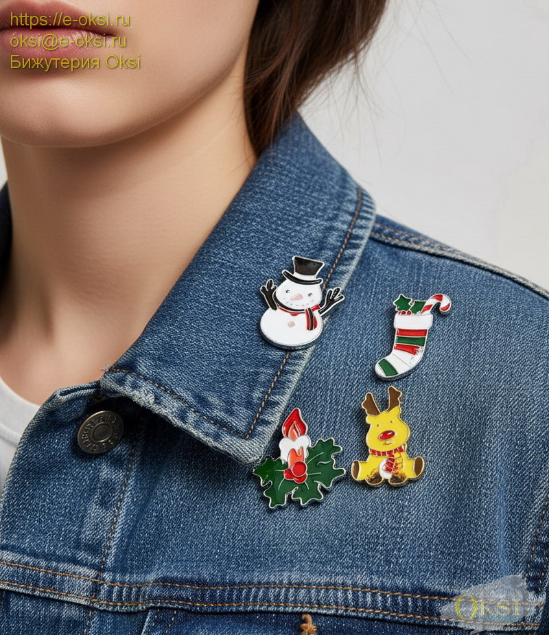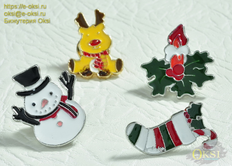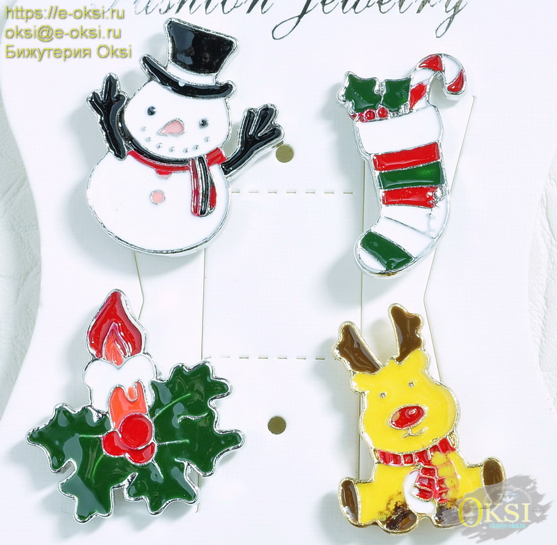 Цена за 4 штуки. Комплект ярких, эффектных брошей '' Новый год''. Качественное родиевое покрытие серебряного цвета, ювелирная эмаль. Размеры: снеговик - 2,6 х 2,3 см., свеча 2,6 х 2,3 см., носок 2,4 х 1,3 см., олень 2,6 х 2 см, застежка кнопка. Яркий и недорогой подарок к празднику.