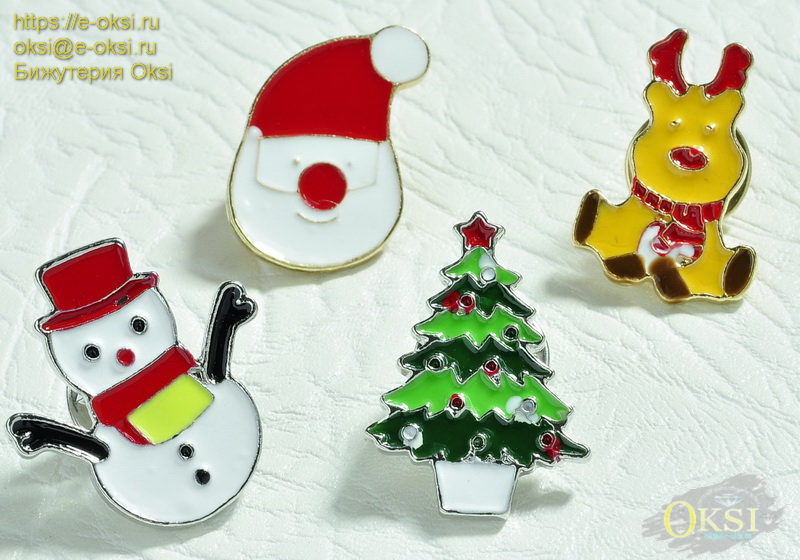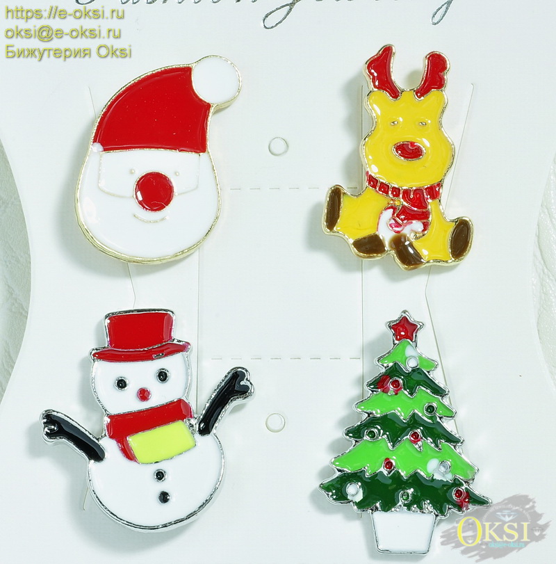 Цена за 4 штуки. Комплект ярких, эффектных брошей '' Новый год''. Качественное гальваническое покрытие золотого цвета, ювелирная эмаль. Размеры: снеговик - 2,6 х 2,3 см., ёлка 2,5 х 2 см., см., дед мороз 2,6 х 1,5 см., олень 2,6 х 2 см, застежка кнопка. Яркий и недорогой подарок к празднику.