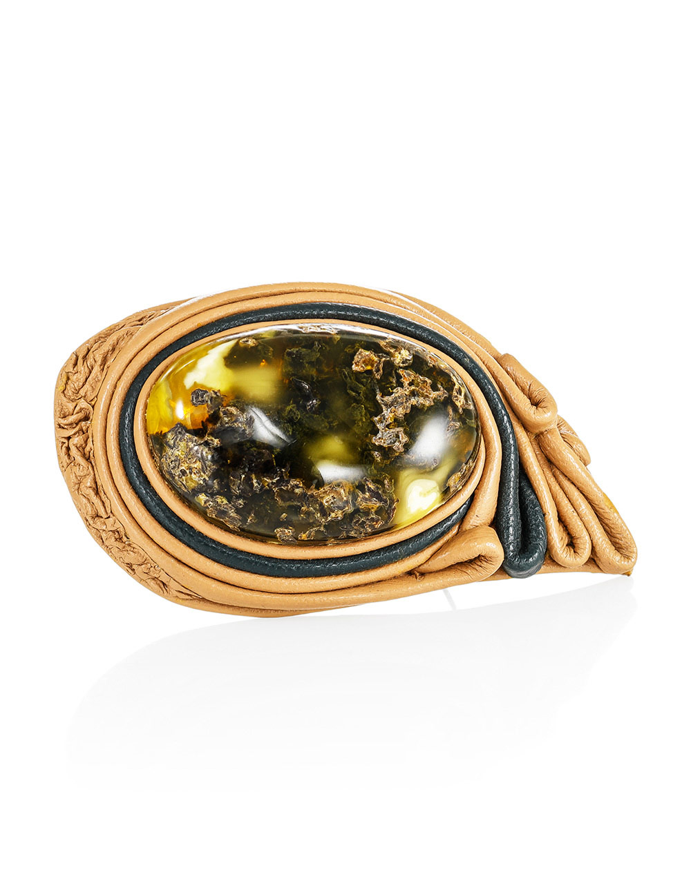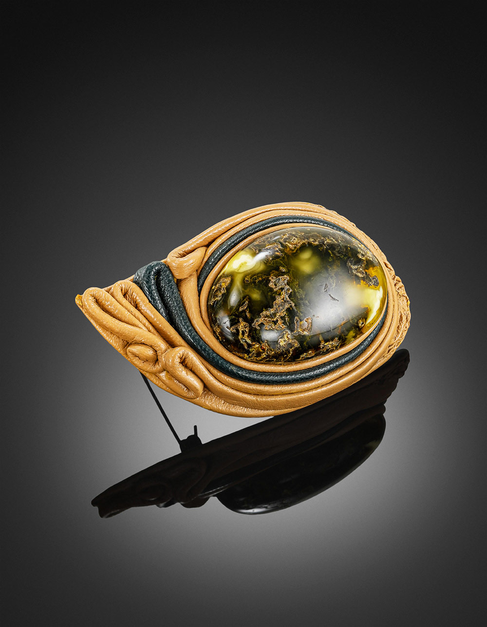 Пейзажный янтарь и глянцевая кожа: завитки повторяют линии лиан, будто камень вырос в этом переплетении. Украшение подойдет к шерстяному пальто, джинсовой куртке или холщовой сумке. Эта брошь для тех, кто ценит вещи с характером: чуть дерзким, но настоящим.