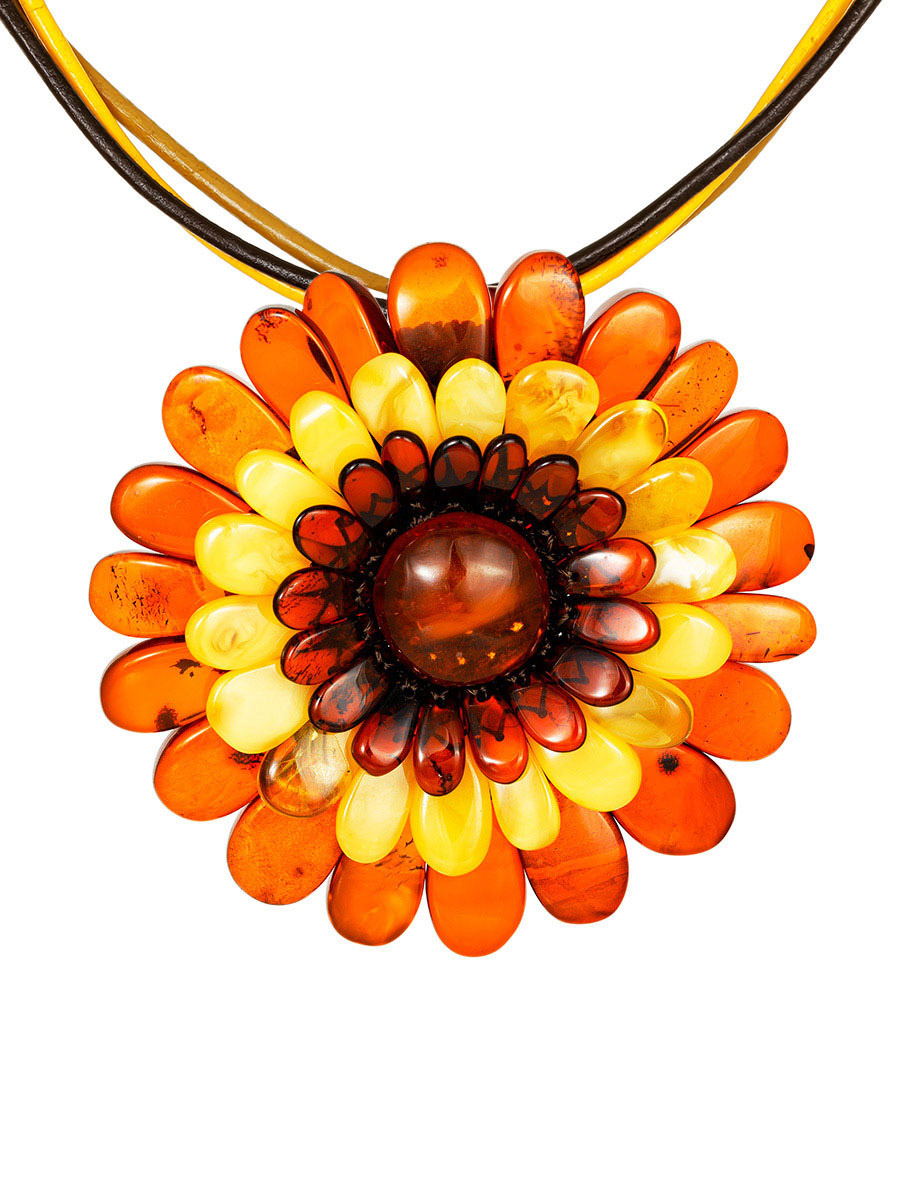 Брошь-подвеска из натурального балтийского янтаря разных оттенков «Хризантема»