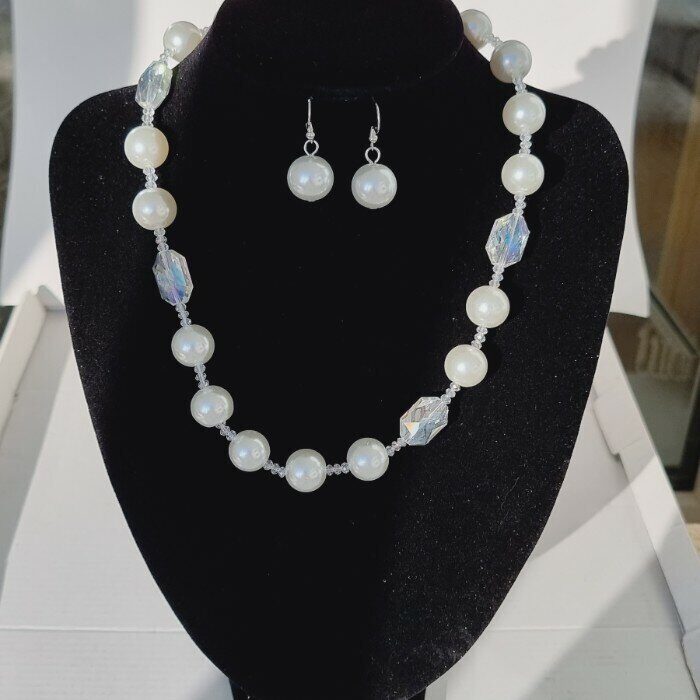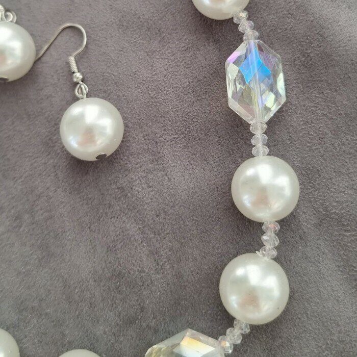Описание Длина бус: 45 (+6,5) см. Диаметр бусины: 1,3 см. Замок: карабин. Серьги размер: 3,7*1,3 см. Замок: петля. Материал: бижутерный сплав, иск.жемчуг. Вес: 85 гр.