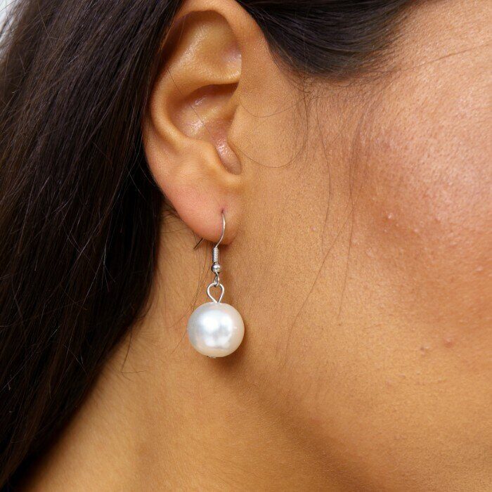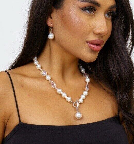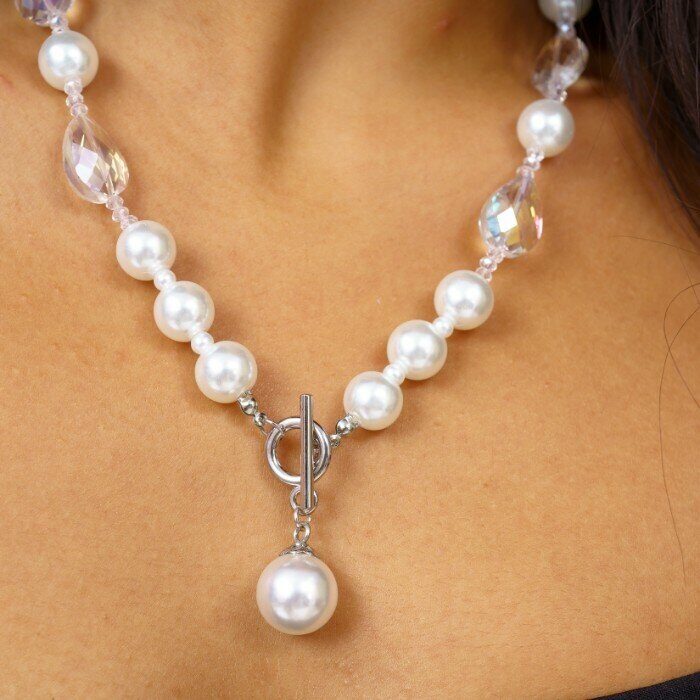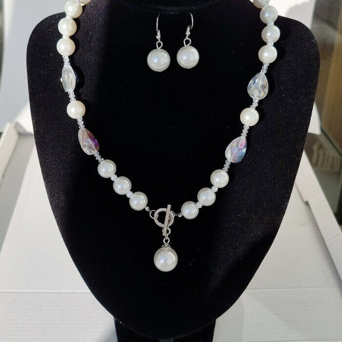 Описание Длина бус: 48 см. Диаметр бусины: 1 см. Серьги размер: 3,7*1,3 см. Замок: петля. Материал: бижутерный сплав, иск.жемчуг. Вес: 78 гр.