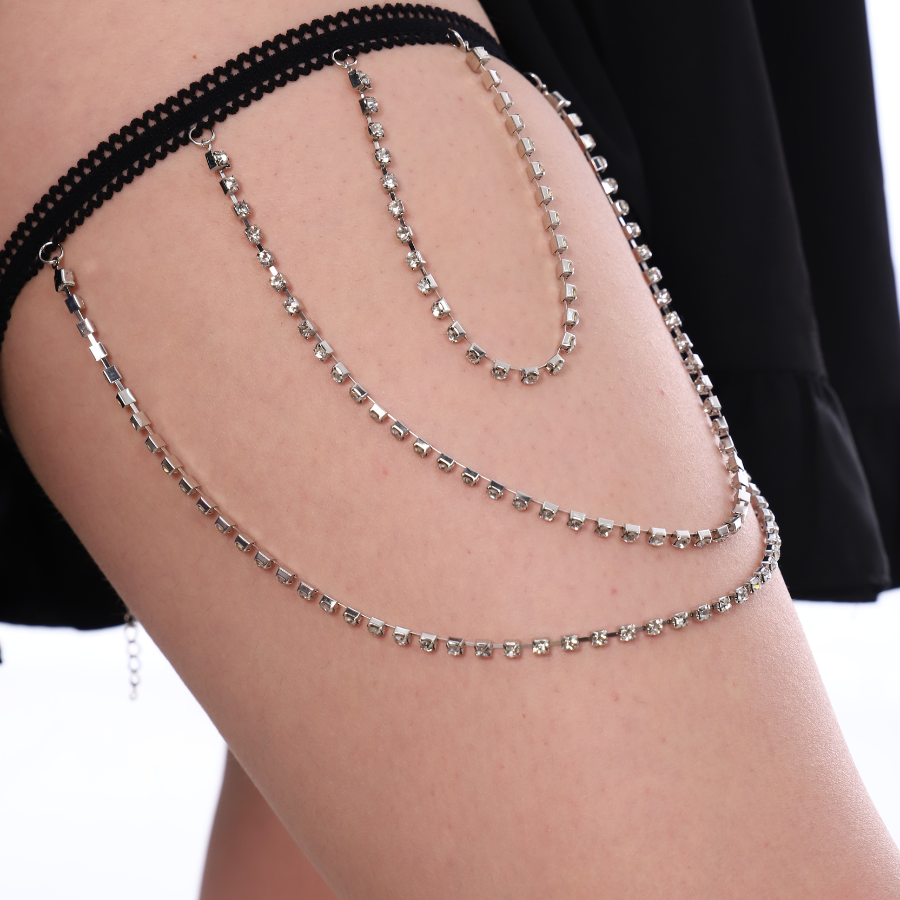 Описание Набедренная повязка на ногу с цепью и декоративными элементами, на резинке. Цепочку можно надеть под шорты, сарафан или юбку, также украсить свой образ в вечернем наряде. С подвязкой на ногу Вы всегда будете неотразимы и ловить на себе восхищенные взгляды. Длина резинки: 36 (+7) см. Максимальная длина цепей: 19 см. Состав: металл, ткань, фианиты. Вес: 18 гр.