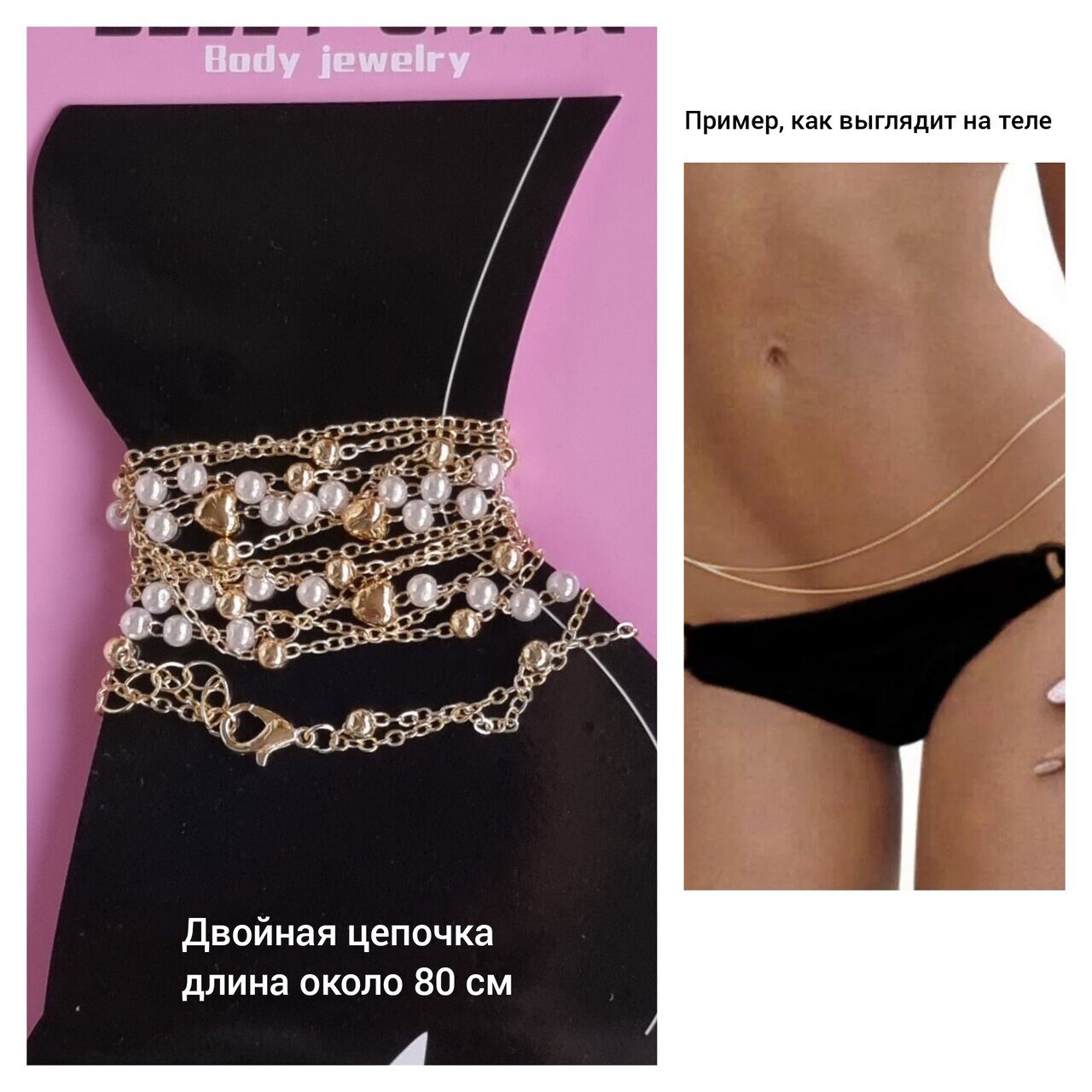 Цепочка на тело (живот), с жемчужинами, с сердечками, цвет желтый, 30122, арт.606.977