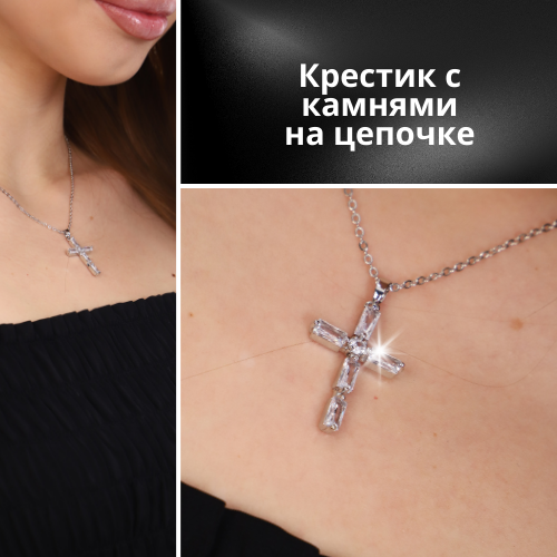 Описание Серебристая тонкая цепочка с крестиком, украшенный камнями и стразами. Легкое украшение на шею, подчеркнет вашу женственность. Подвеска - идеальный варинат как на каждый день, так и для праздничнх образов. Длина цепочки: 41(+5) см. Размер подвески: 2,5*1,8 см . Замок: карабин. Состав: металл, фианиты. Вес: 5 гр.