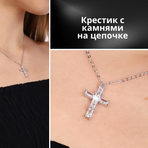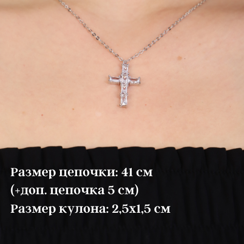 Описание Серебристая тонкая цепочка с крестиком, украшенный камнями и стразами. Легкое украшение на шею, подчеркнет вашу женственность. Подвеска - идеальный варинат как на каждый день, так и для праздничнх образов. Длина цепочки: 41(+5) см. Размер подвески: 2,5*1,5 см . Замок: карабин. Состав: металл, фианиты. Вес: 5 гр.