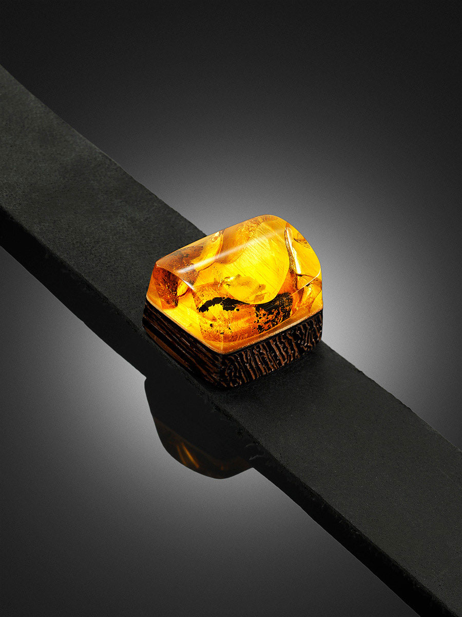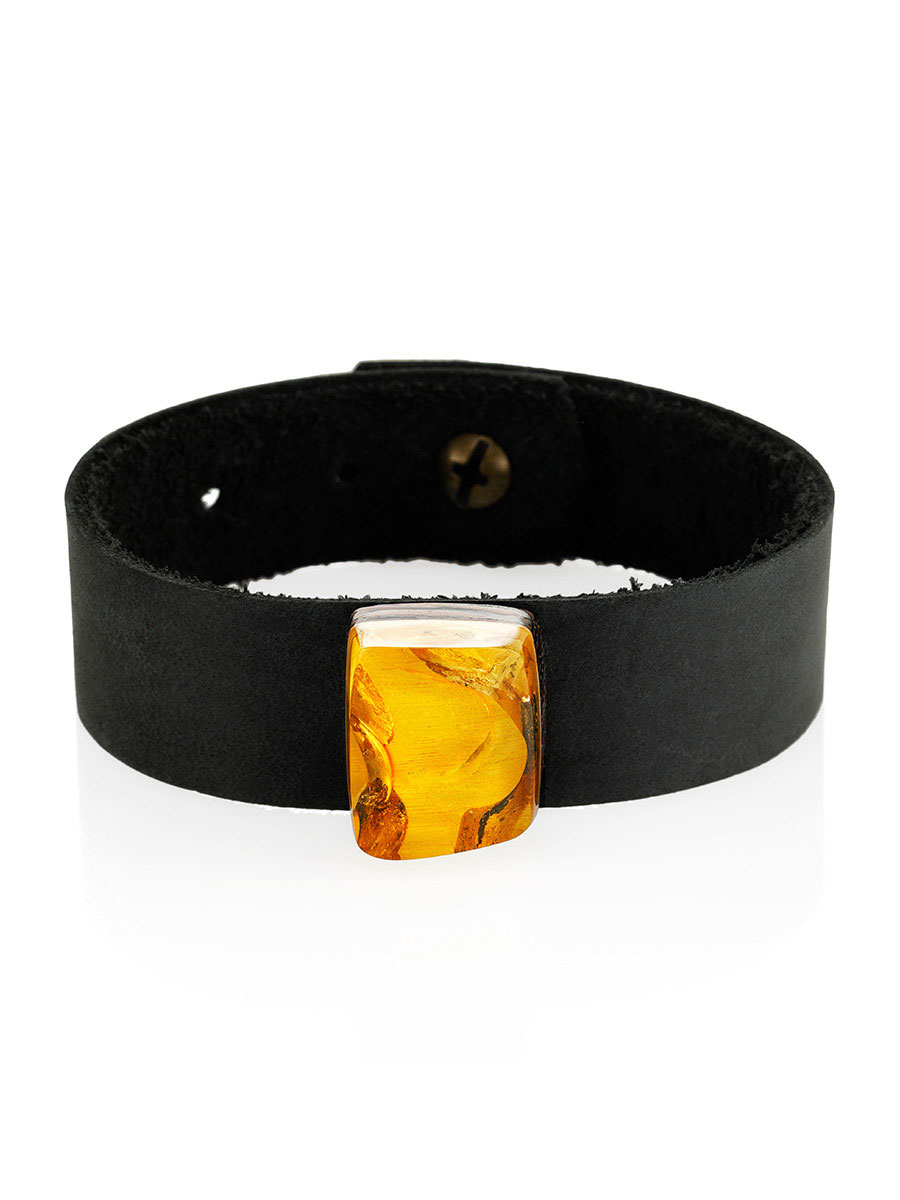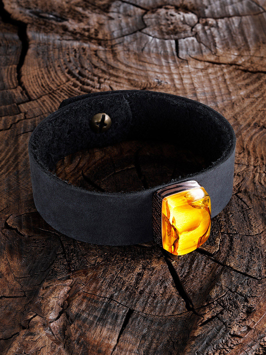 Чёрный кожаный браслет с натуральным балтийским янтарём «Индонезия»