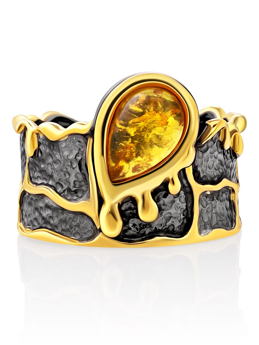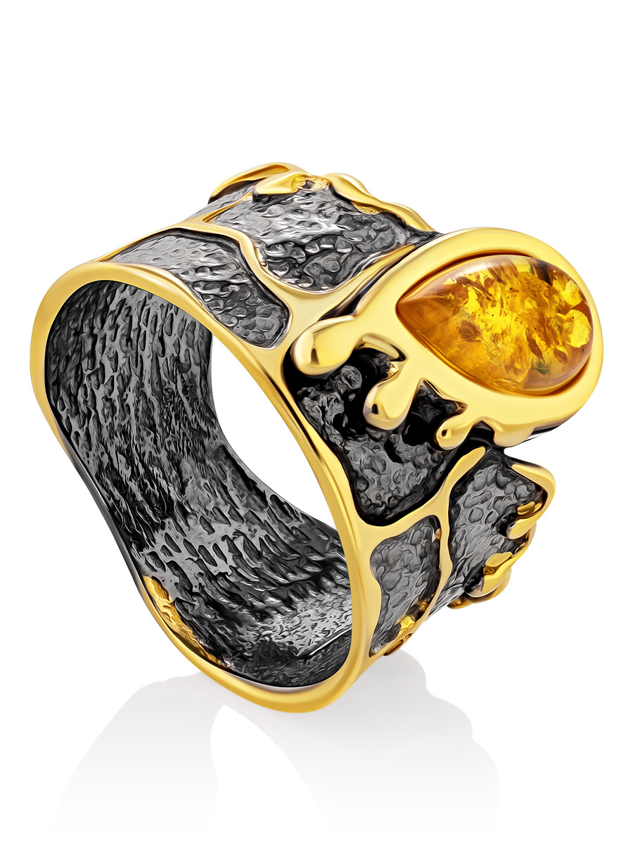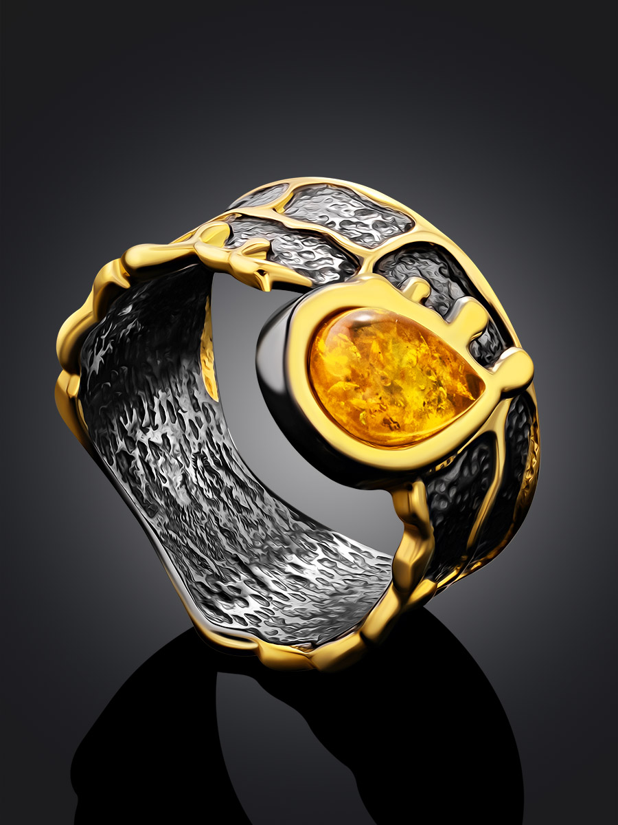 Дизайнерское кольцо с чернением и золочением, украшенное янтарём «Иллюзия»