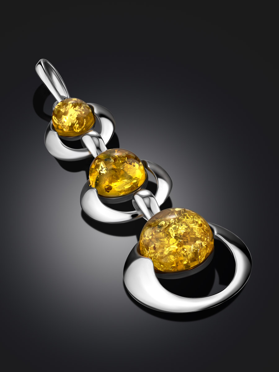 Оригинальная длинная подвеска создана из серебра 925 пробы и украшена круглыми вставками из натурального балтийского янтаря сияющего лимонного цвета. Свободно скреплённые друг с другом секции подвески создают ощущение лёгкости, а яркий цвет янтаря рождает праздничное летнее настроение. Такое украшение можно носить и в будни, и на торжественные мероприятия._x000D_