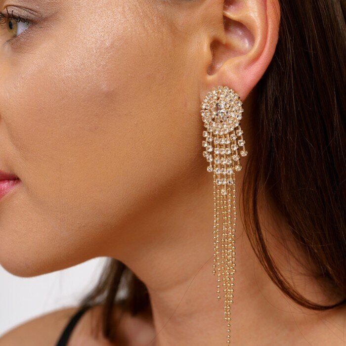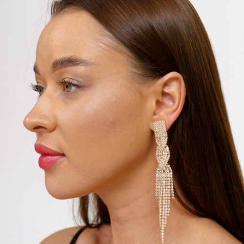 Описание Клипсы "Вечерние" женские, цвет золотистый, камень прозрачный переливающийся. Размер: 10,5*1,7 см. вес: 10 гр.