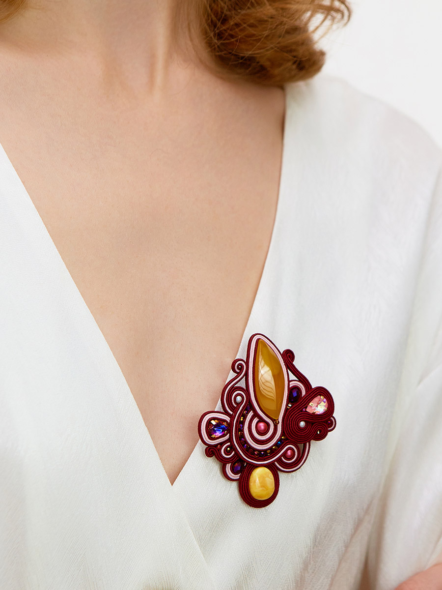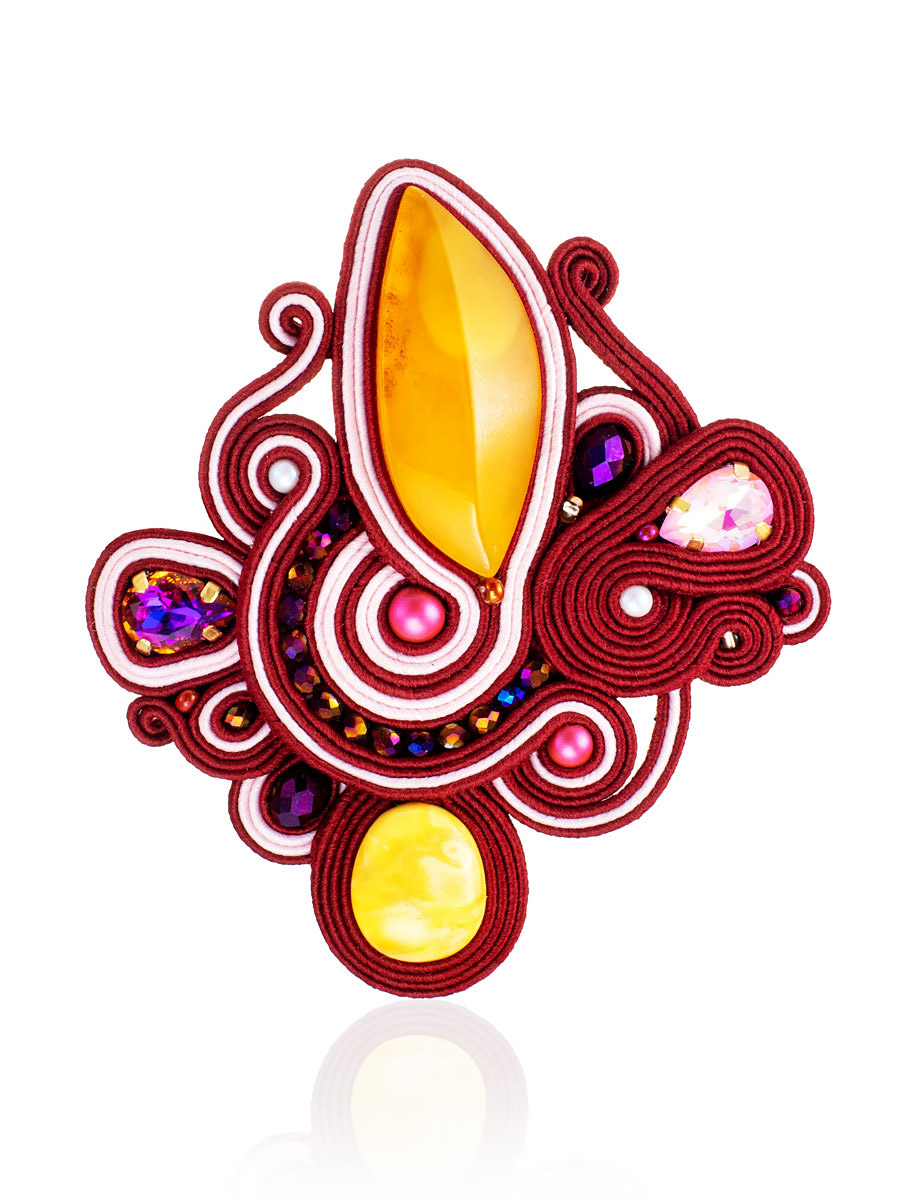 Эффектная плетёная брошь, украшенная натуральным медовым янтарём «Индия»