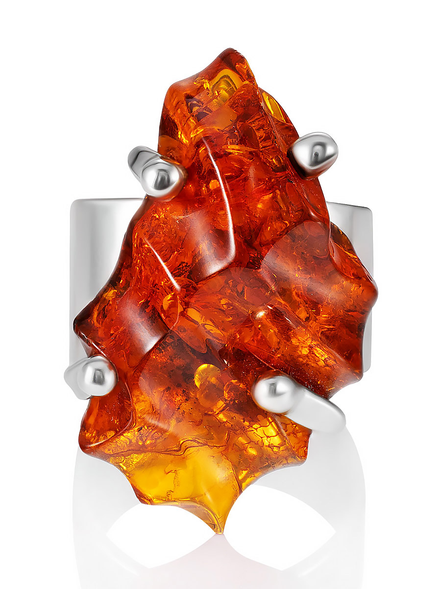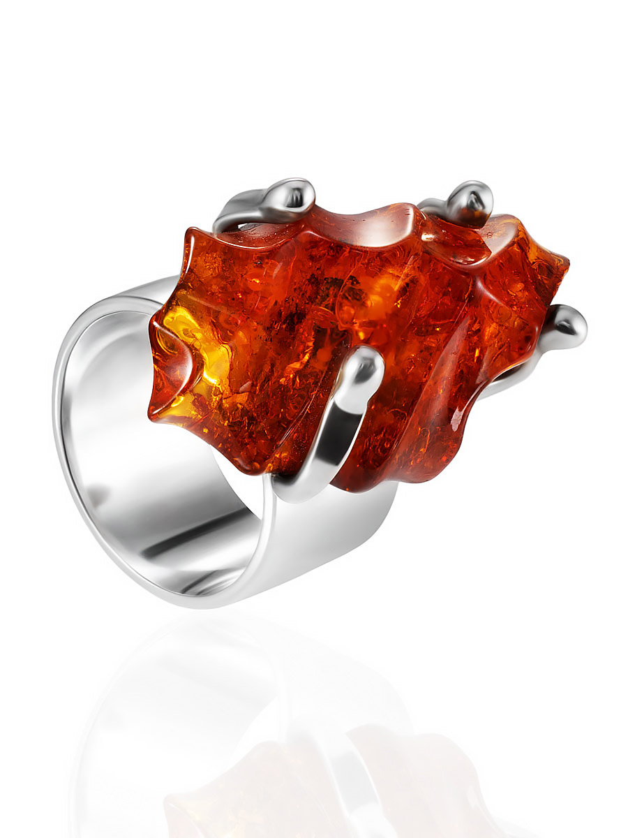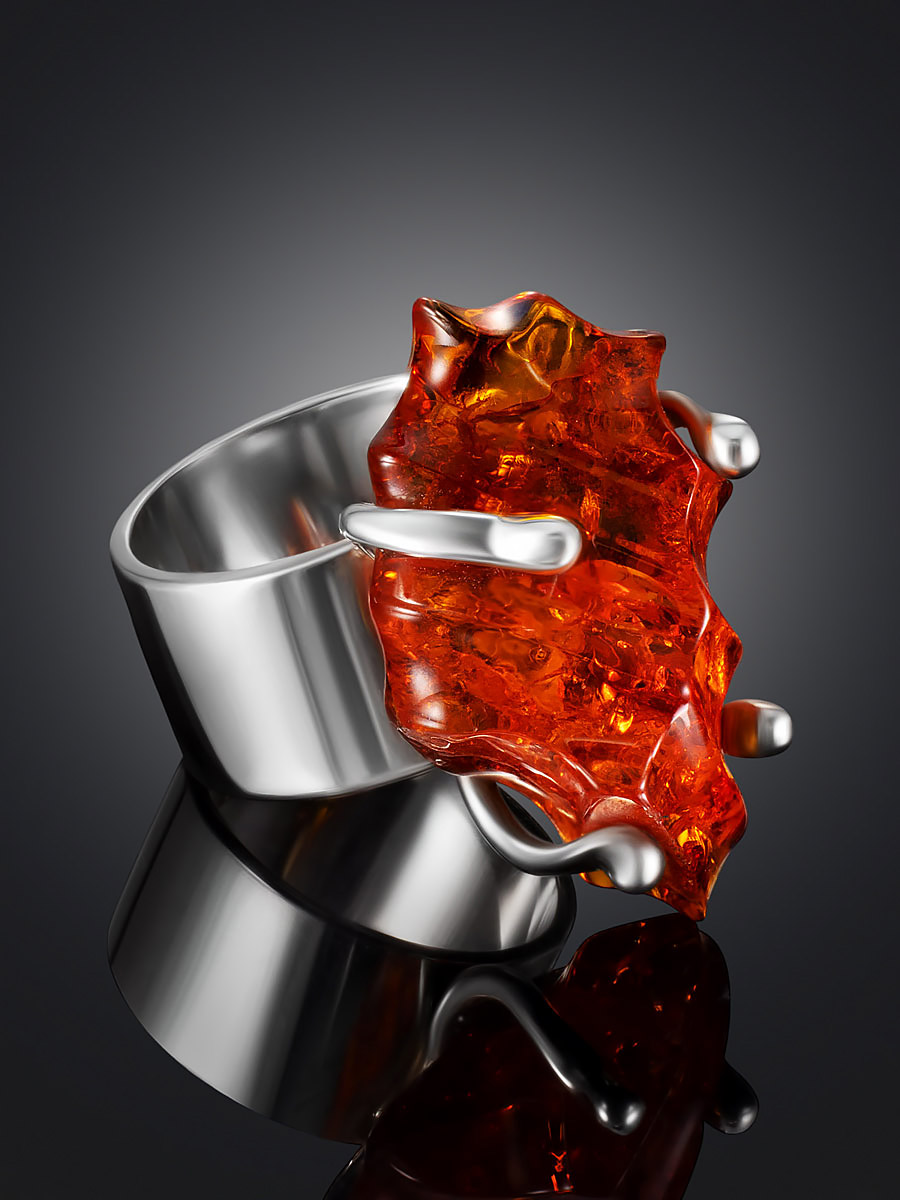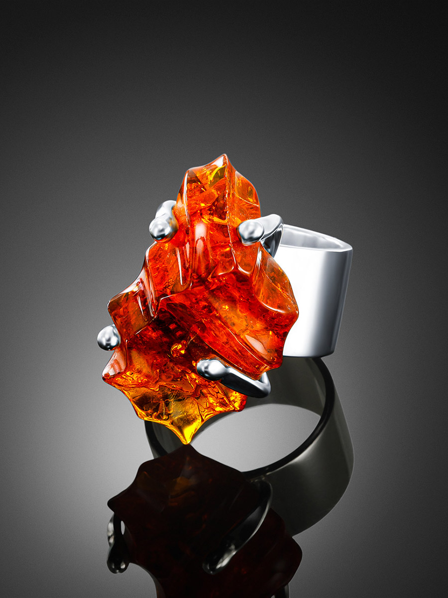 Эффектное кольцо из натурального янтаря с резьбой