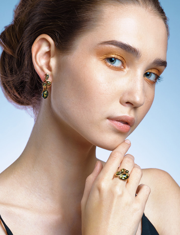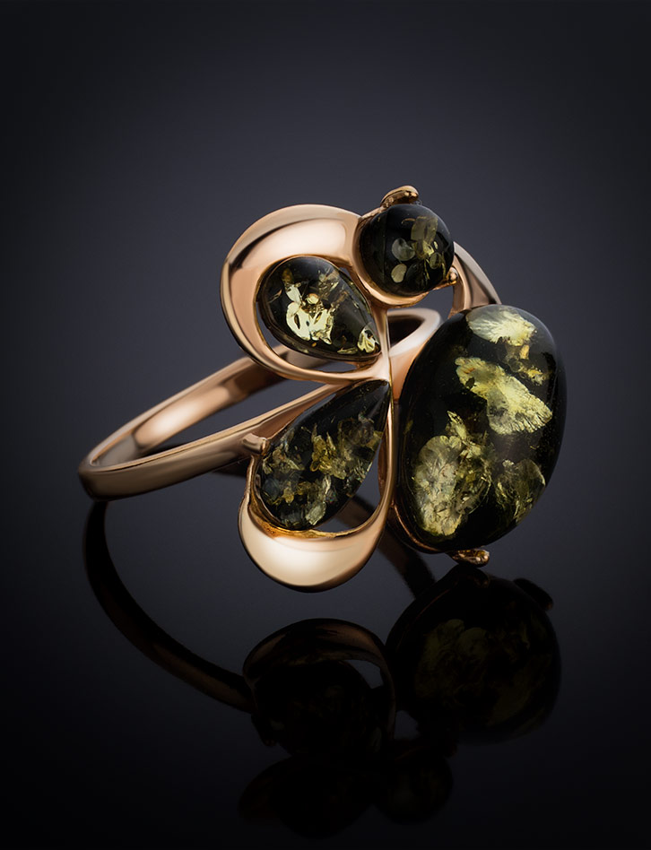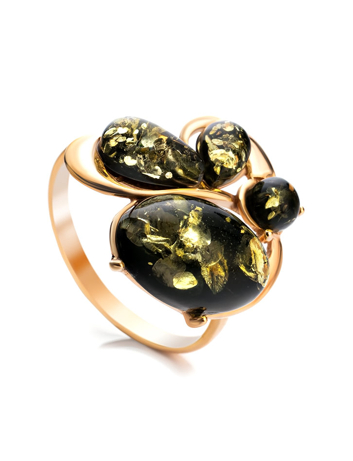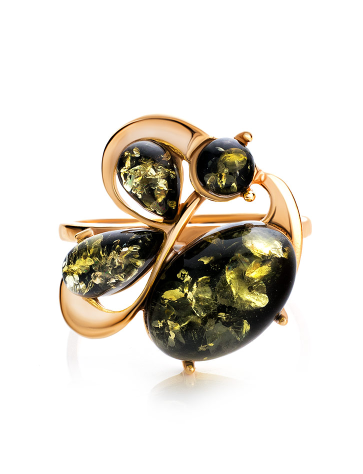 Эффектное кольцо из янтаря зелёного цвета «Симфония»