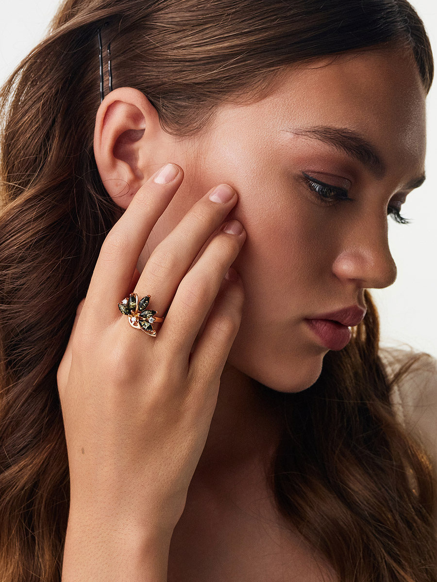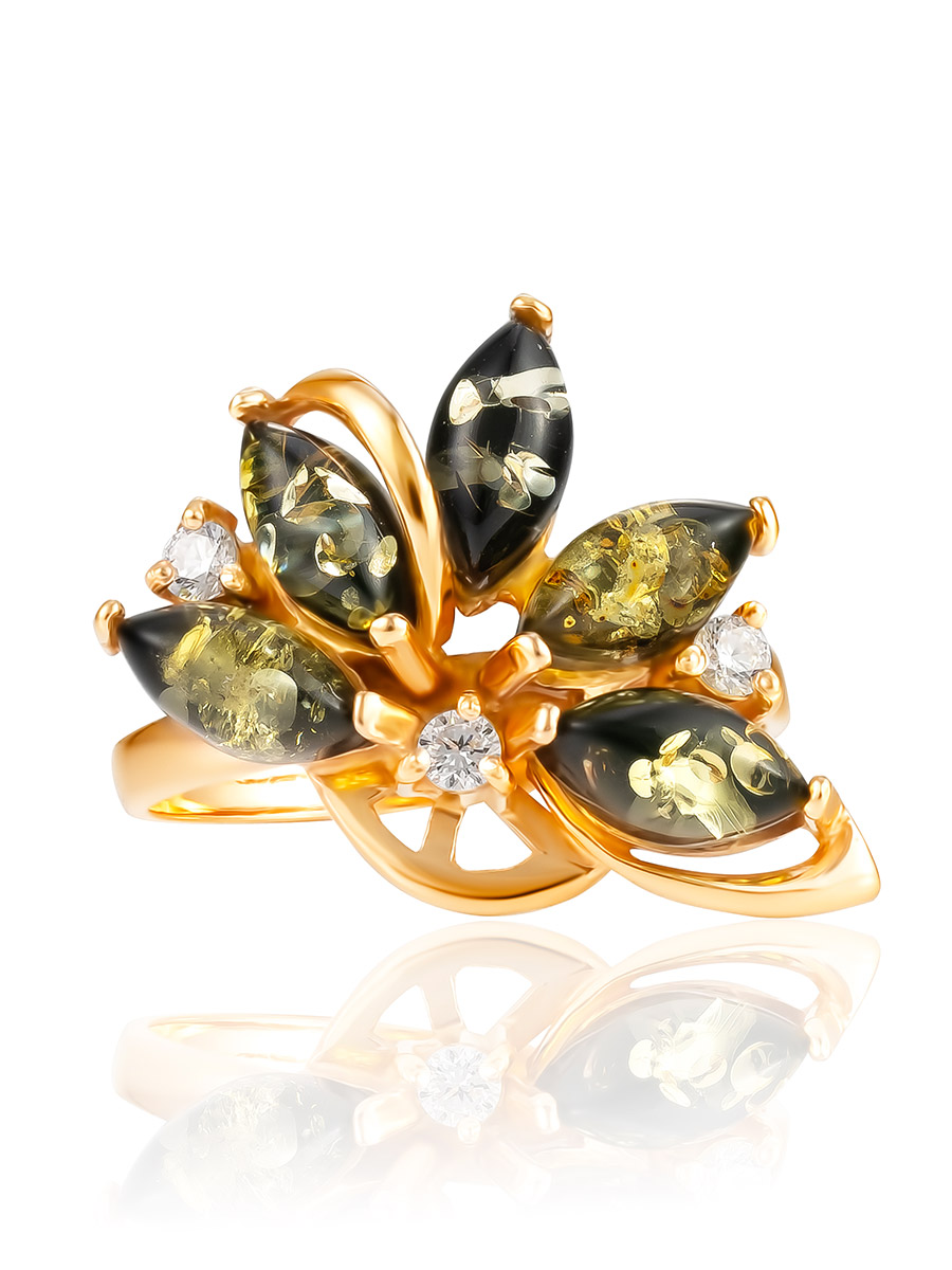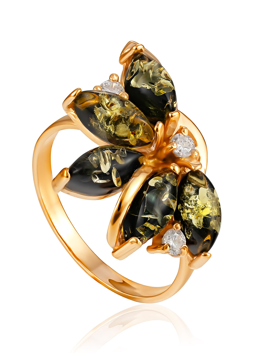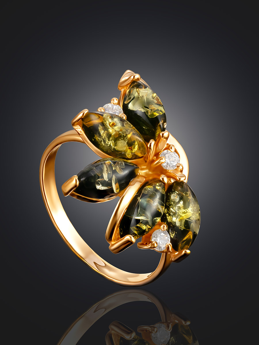 Эффектное кольцо с цельным янтарём зелёного цвета «Лотос»