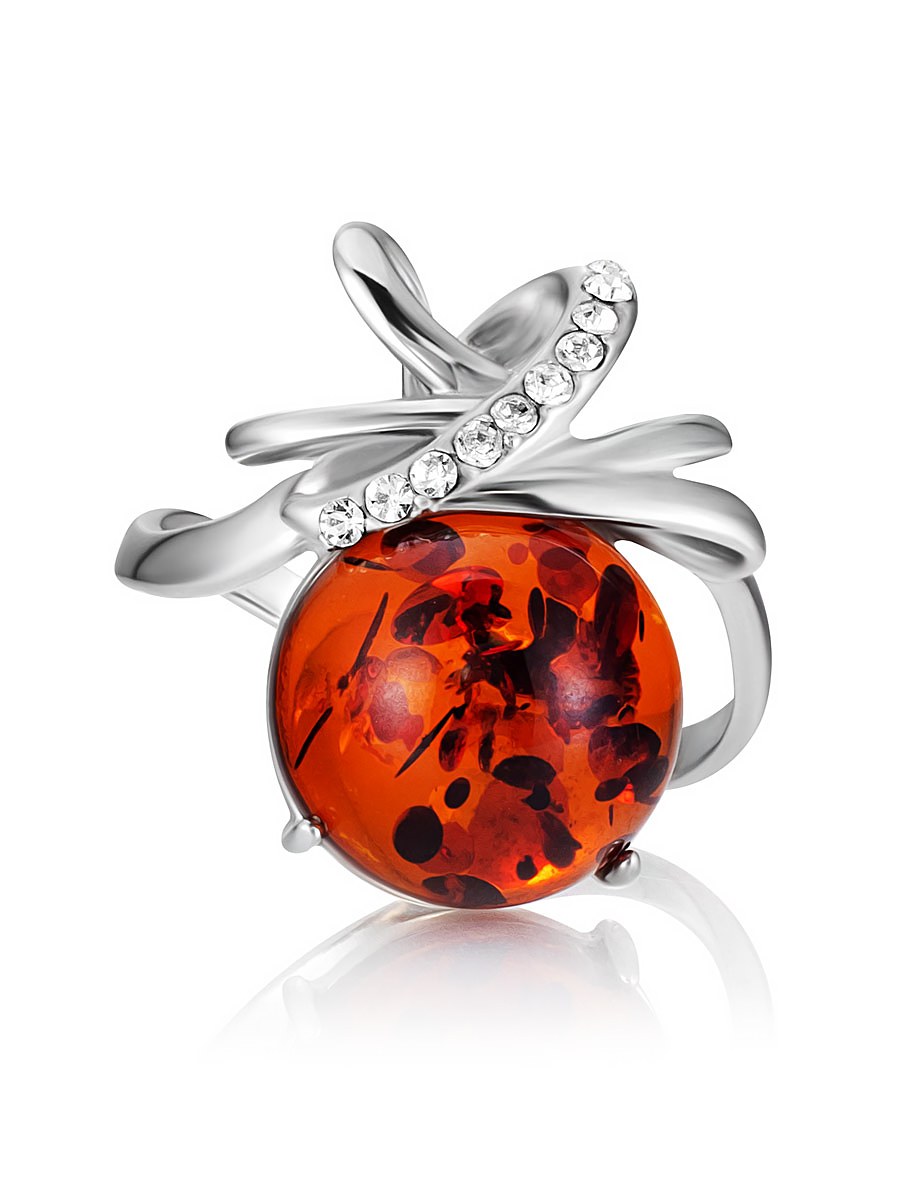 Эффектное кольцо с коньячным янтарём и кристаллами «Черри»