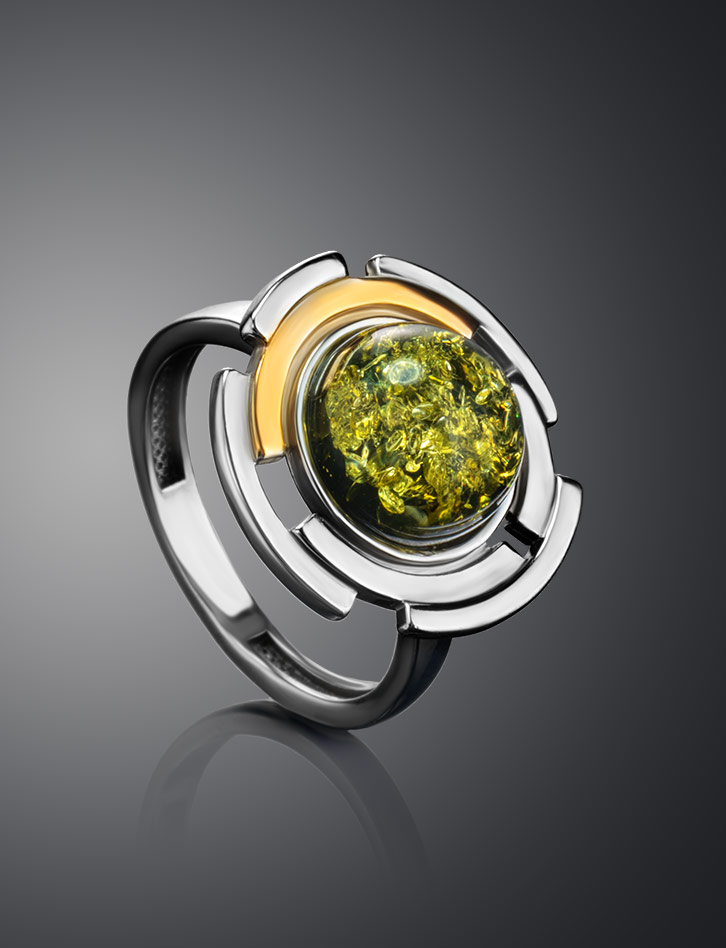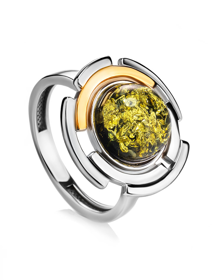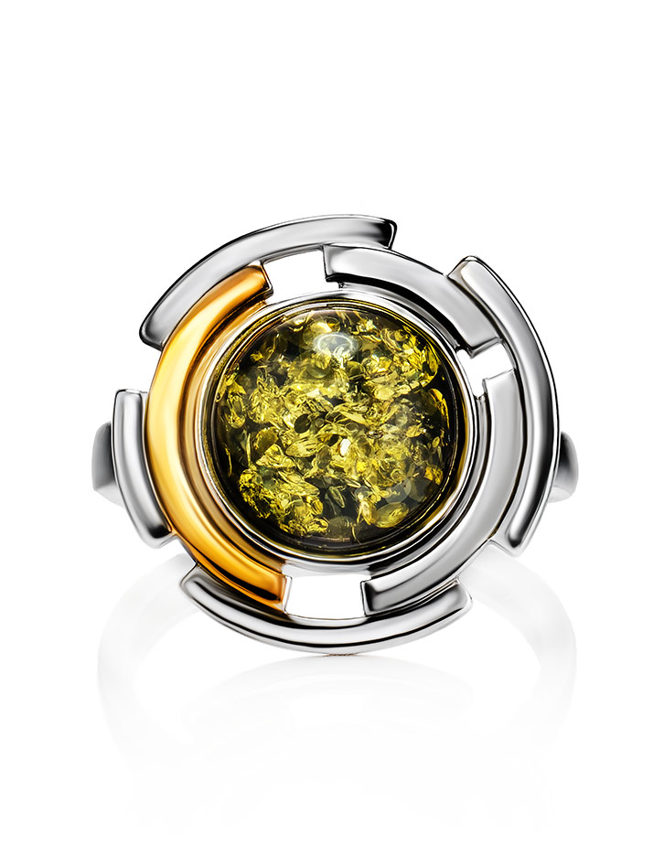 Эффектное кольцо в необычном дизайне «Люмьер» из зелёного янтаря