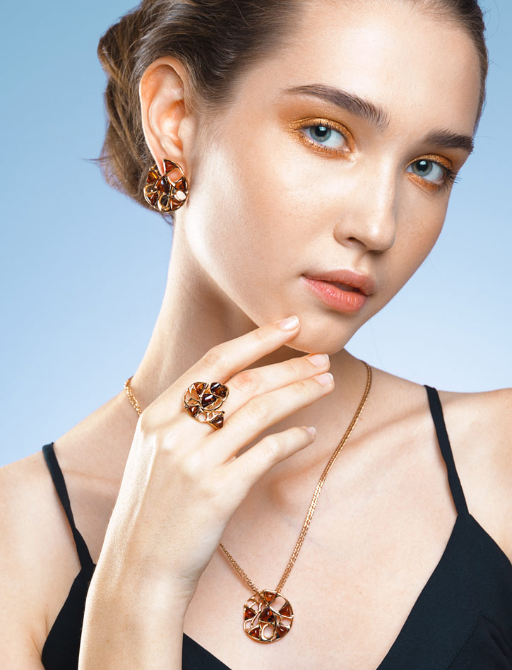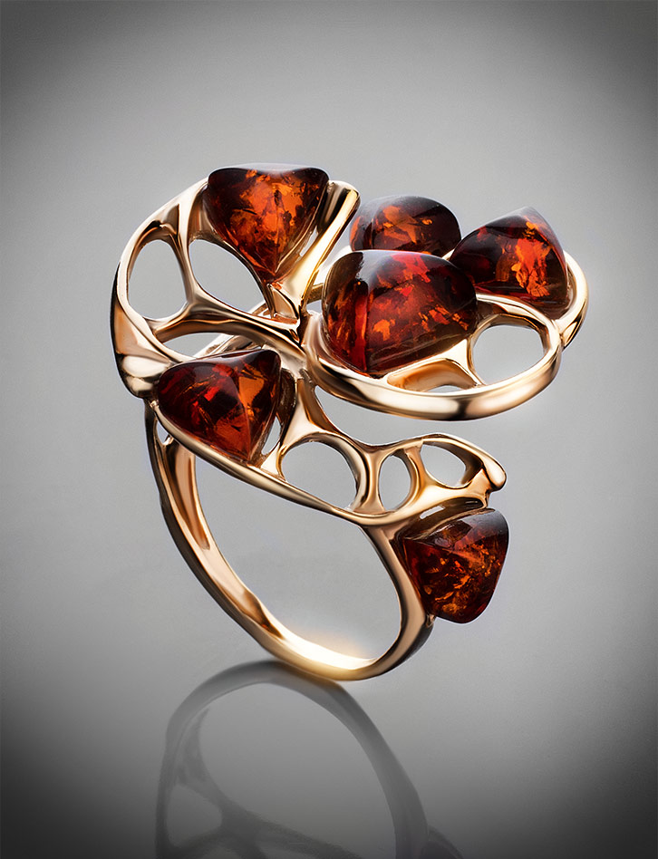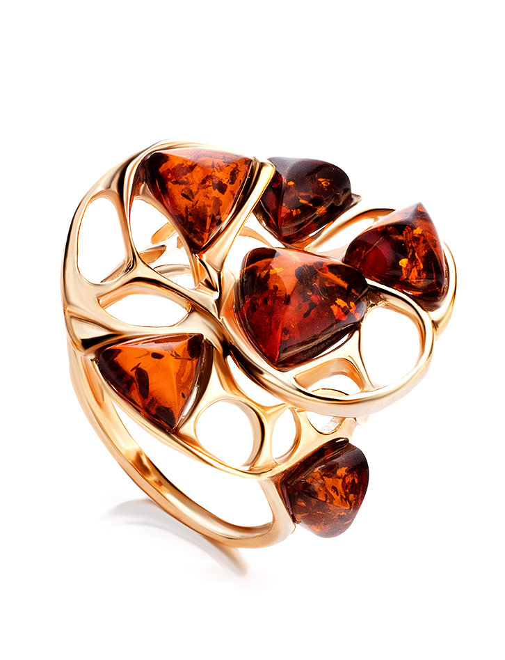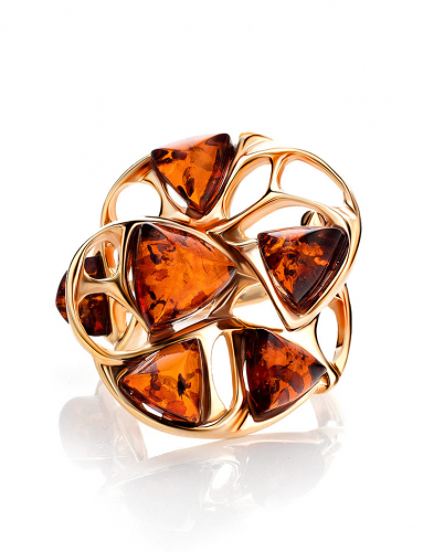Эффектное позолоченное кольцо с натуральным янтарём «Домино»