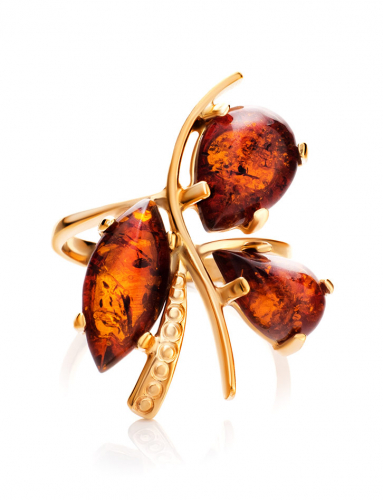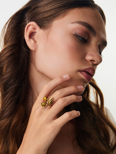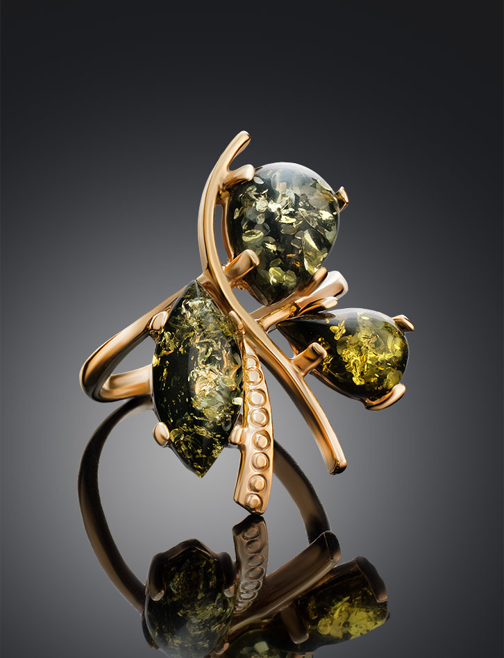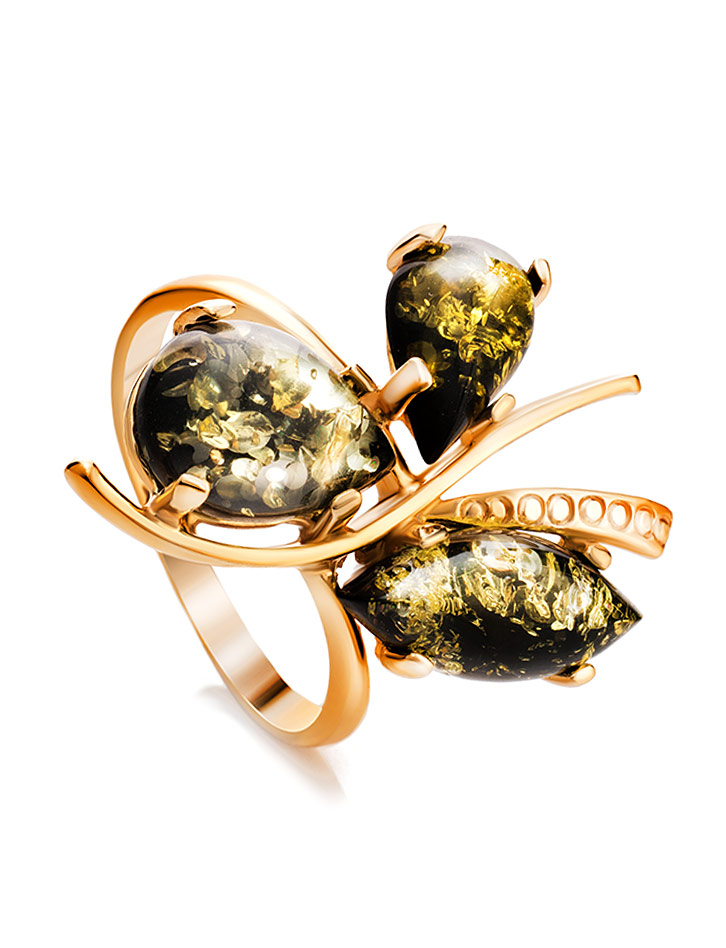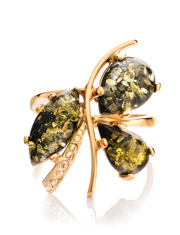Эффектное позолоченное кольцо с зелёным янтарём «Магнолия»