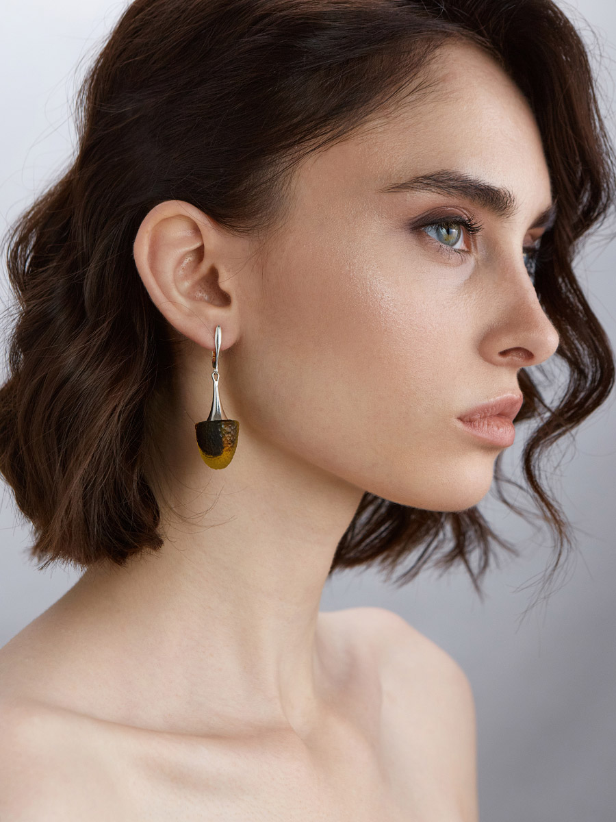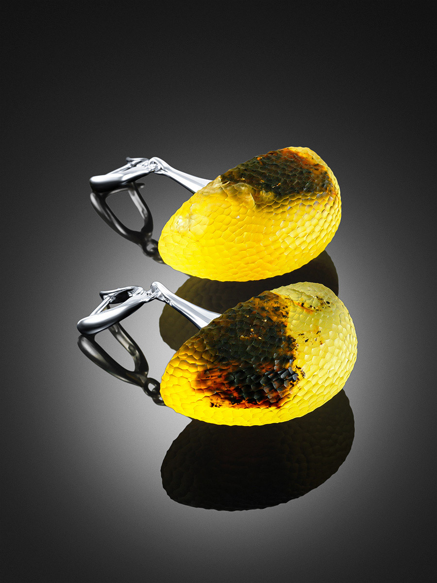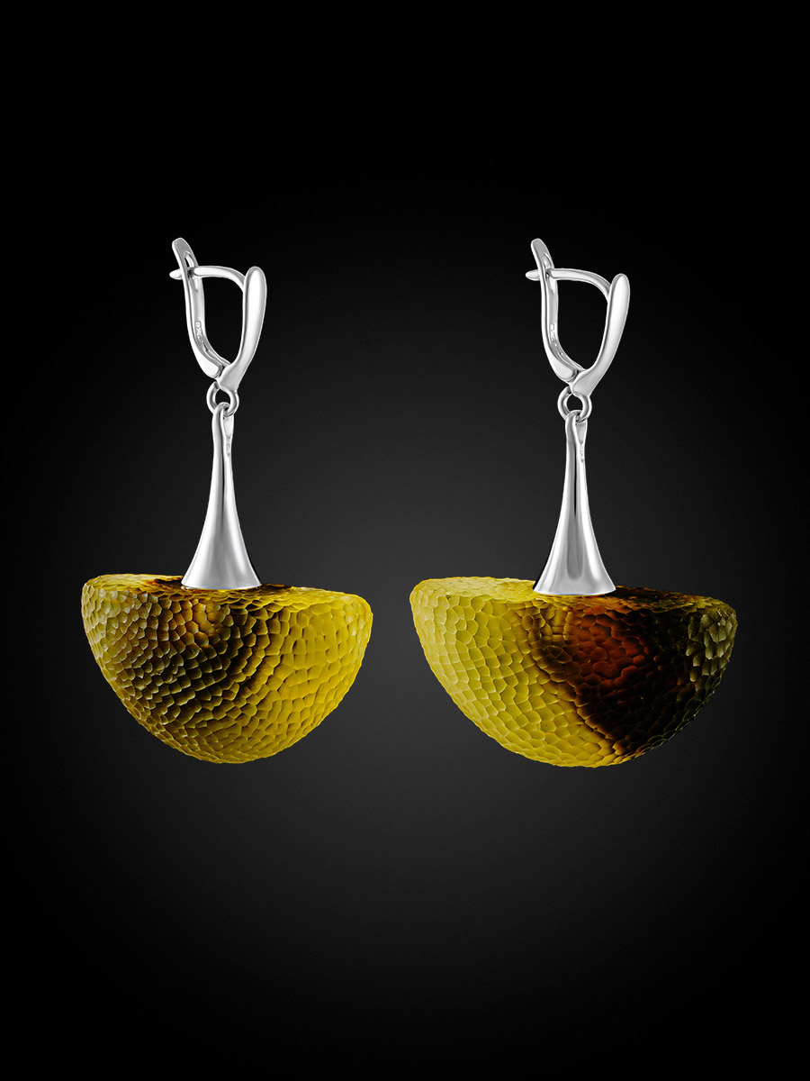 Эффектные крупные серьги «Марс» с необычно обработанным цельным янтарём