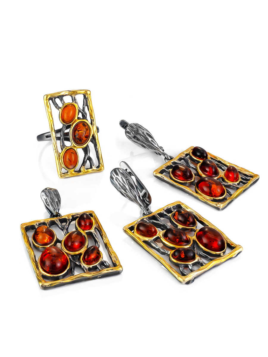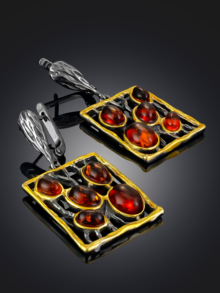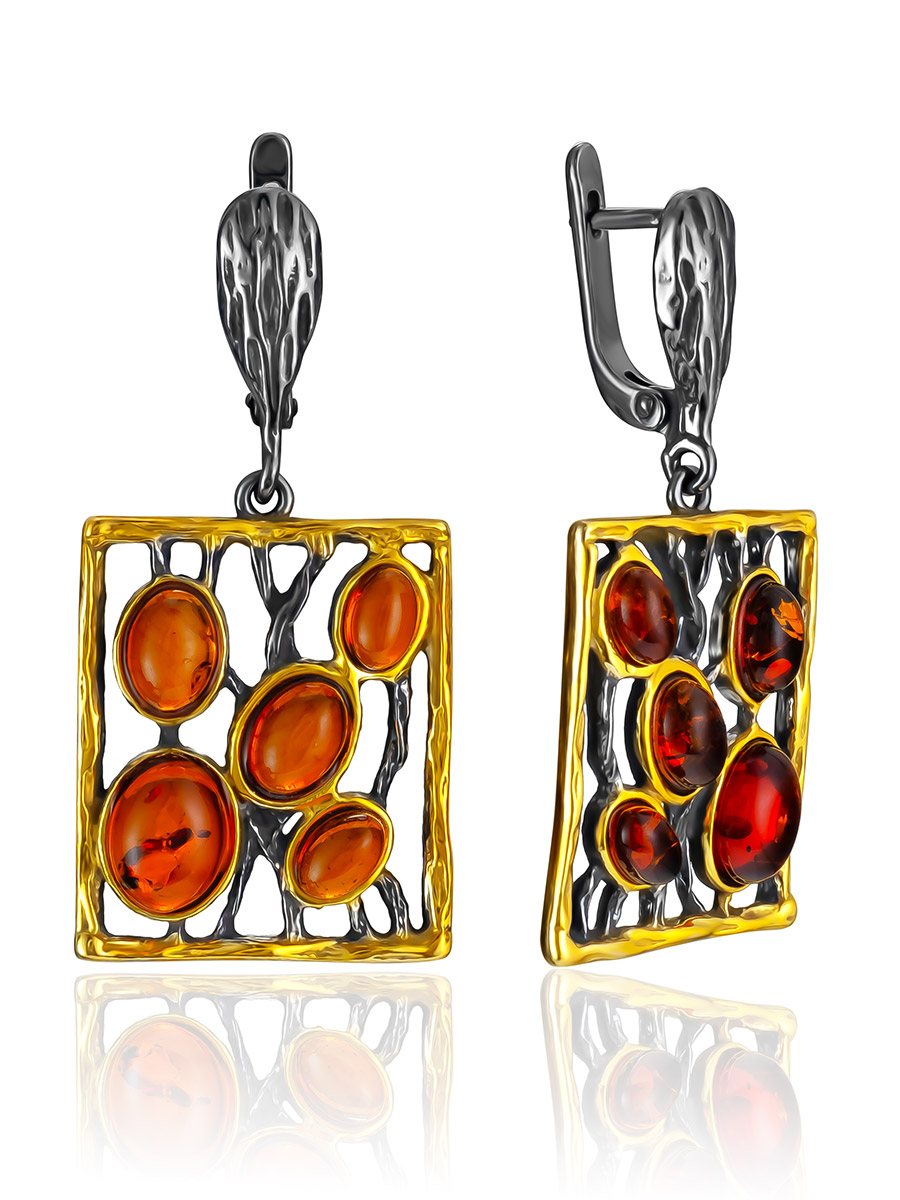 Эффектные серьги «Плеяда» с чернением и золочением, украшенные янтарём