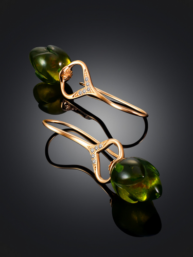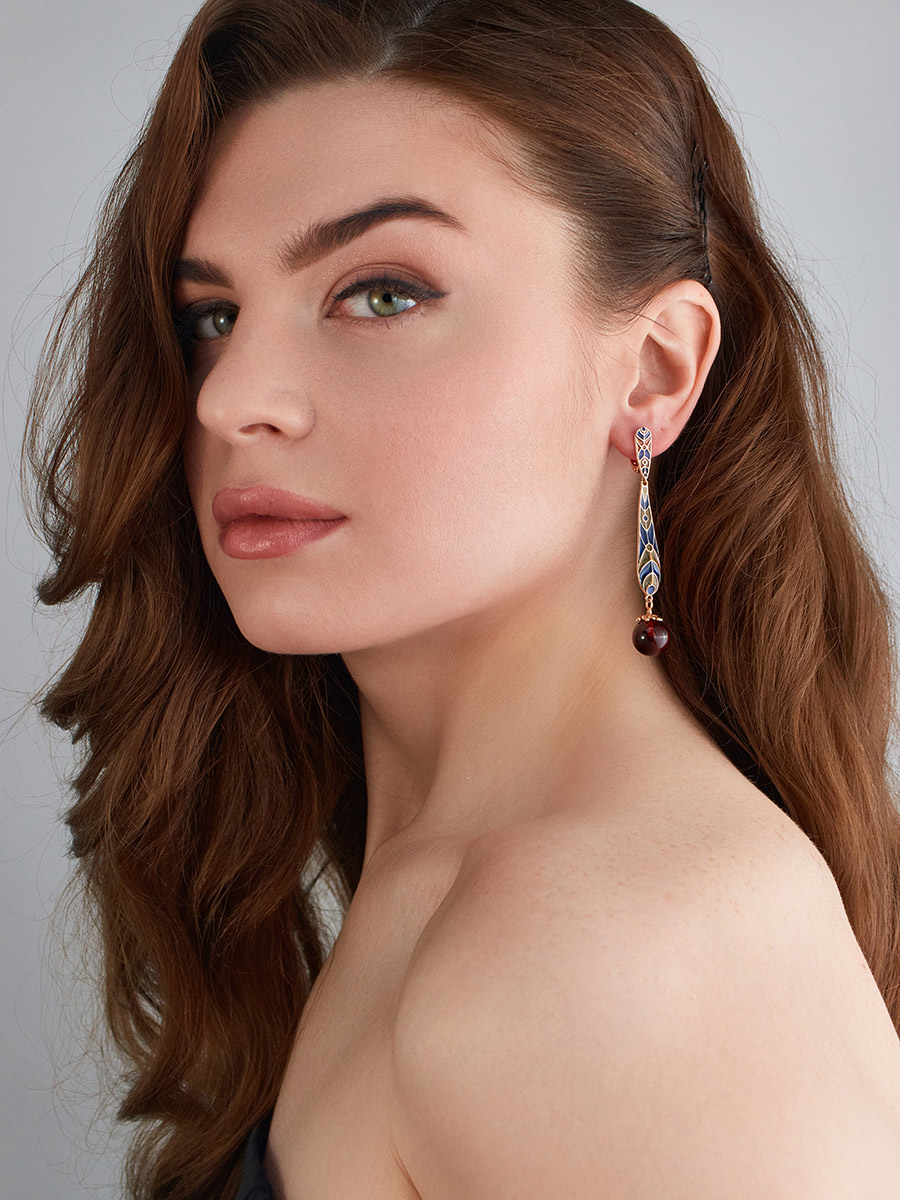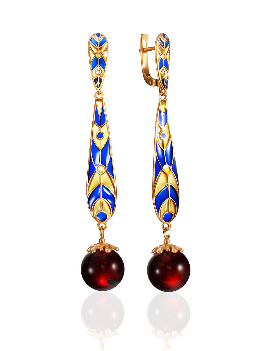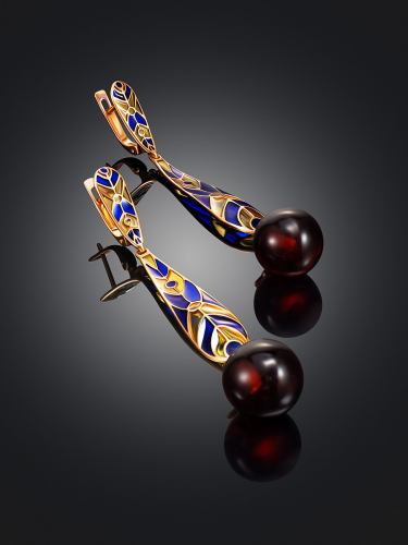 Эффектные серьги с эмалью и натуральным янтарём в оттенке коньяк «Суздаль»