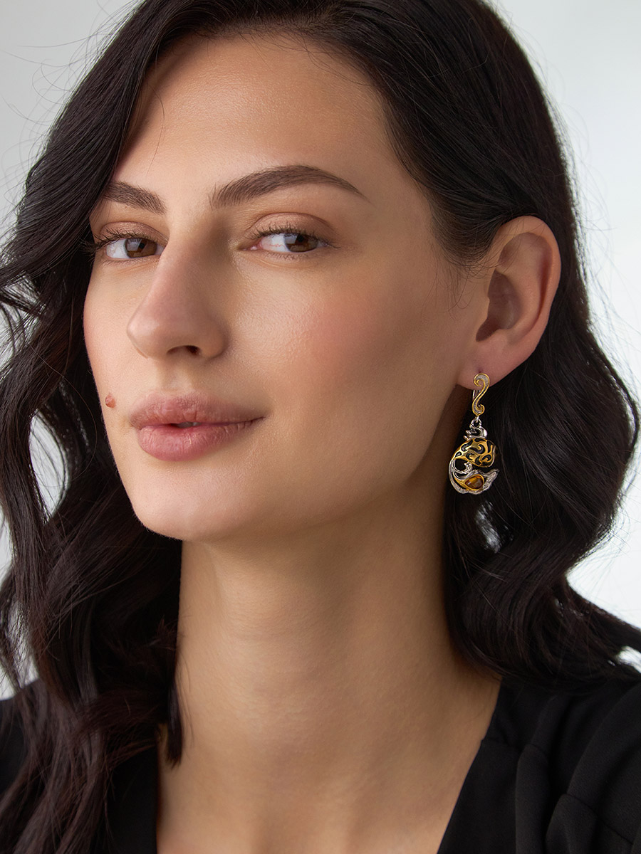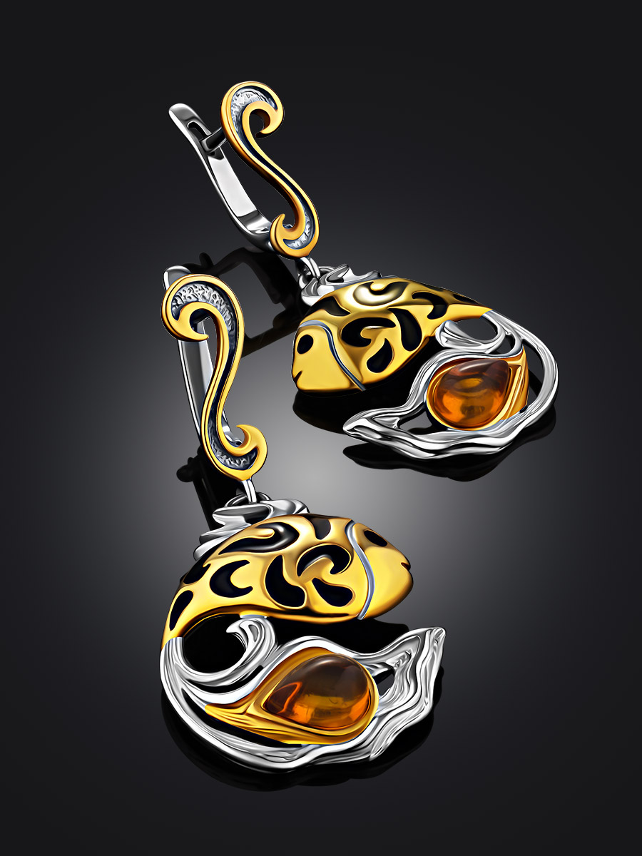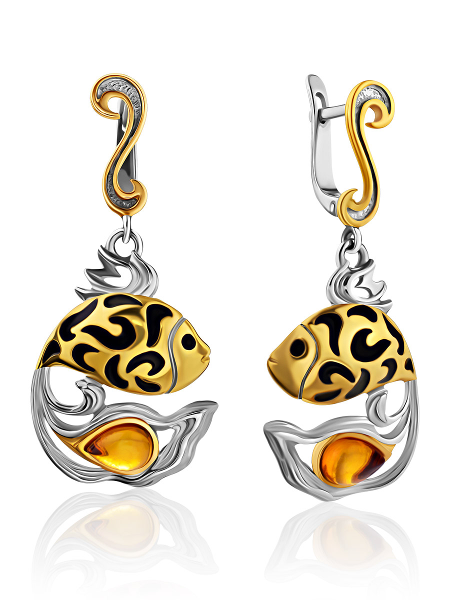 Эффектные серьги с эмалью и золочением, украшенные натуральным янтарём «Рыбка»