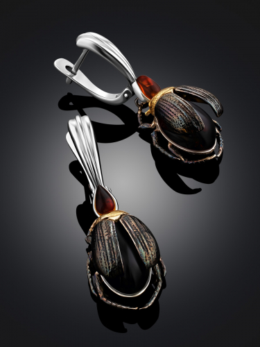Эффектные серьги с натуральным вишнёвым янтарём «Скарабей»