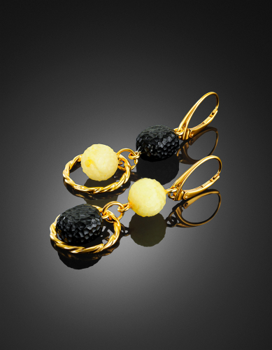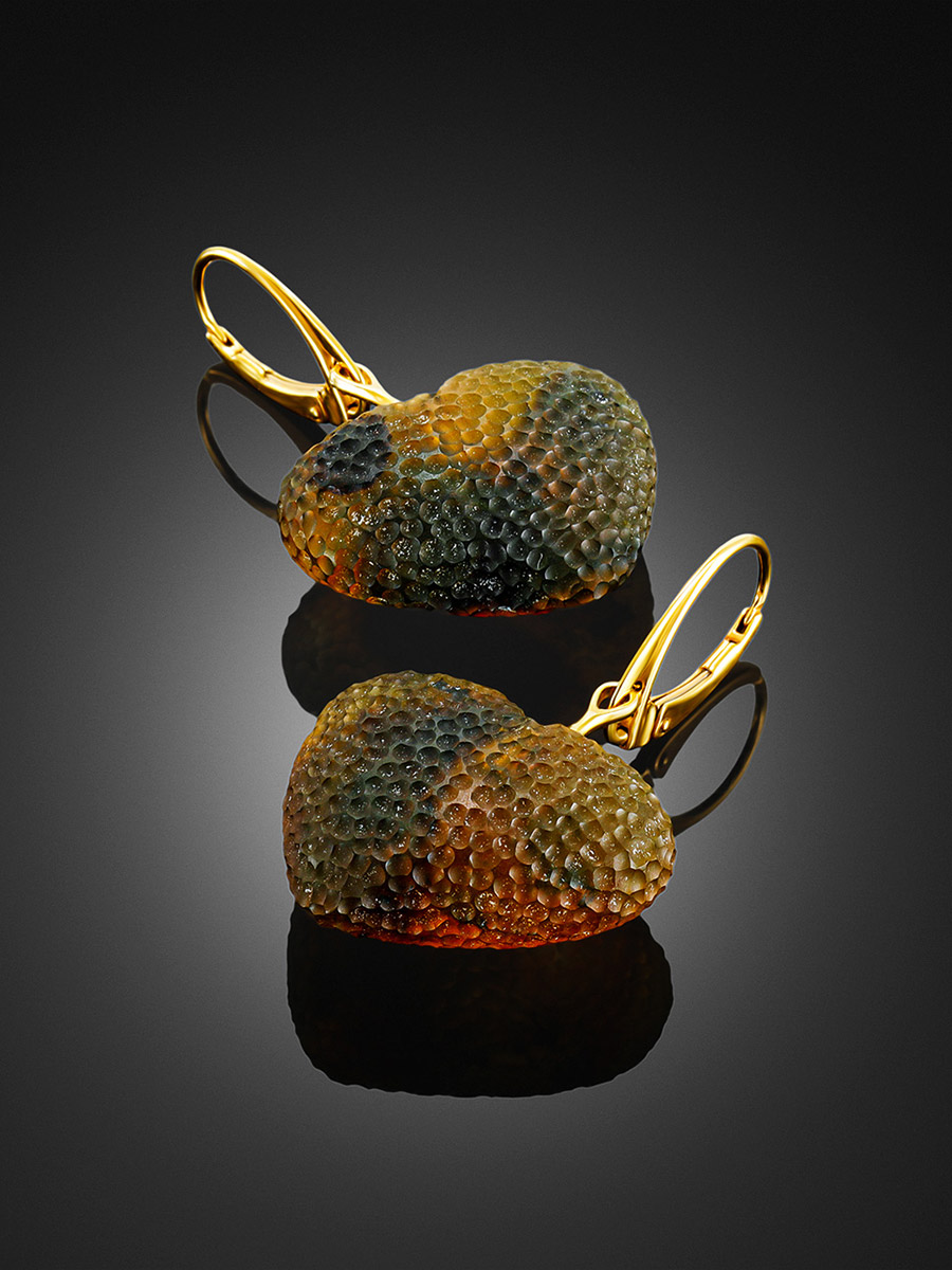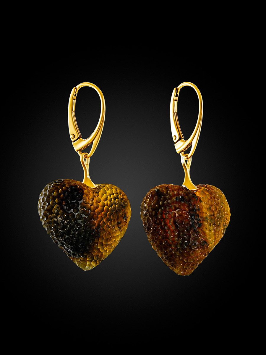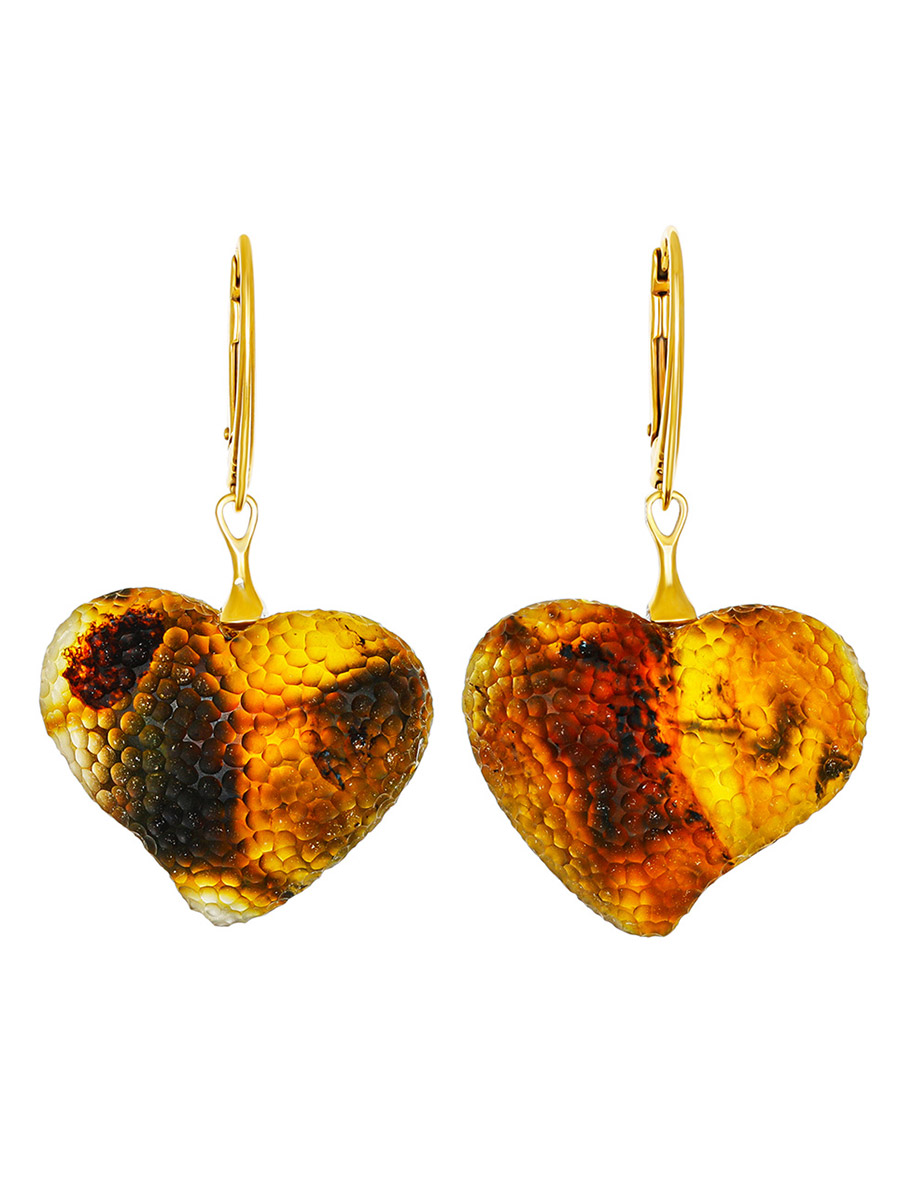 Эффектные серьги «Сердце» из янтаря с «кусаной» поверхностью