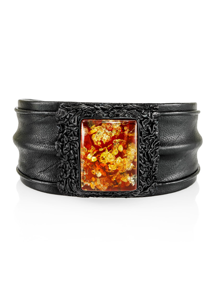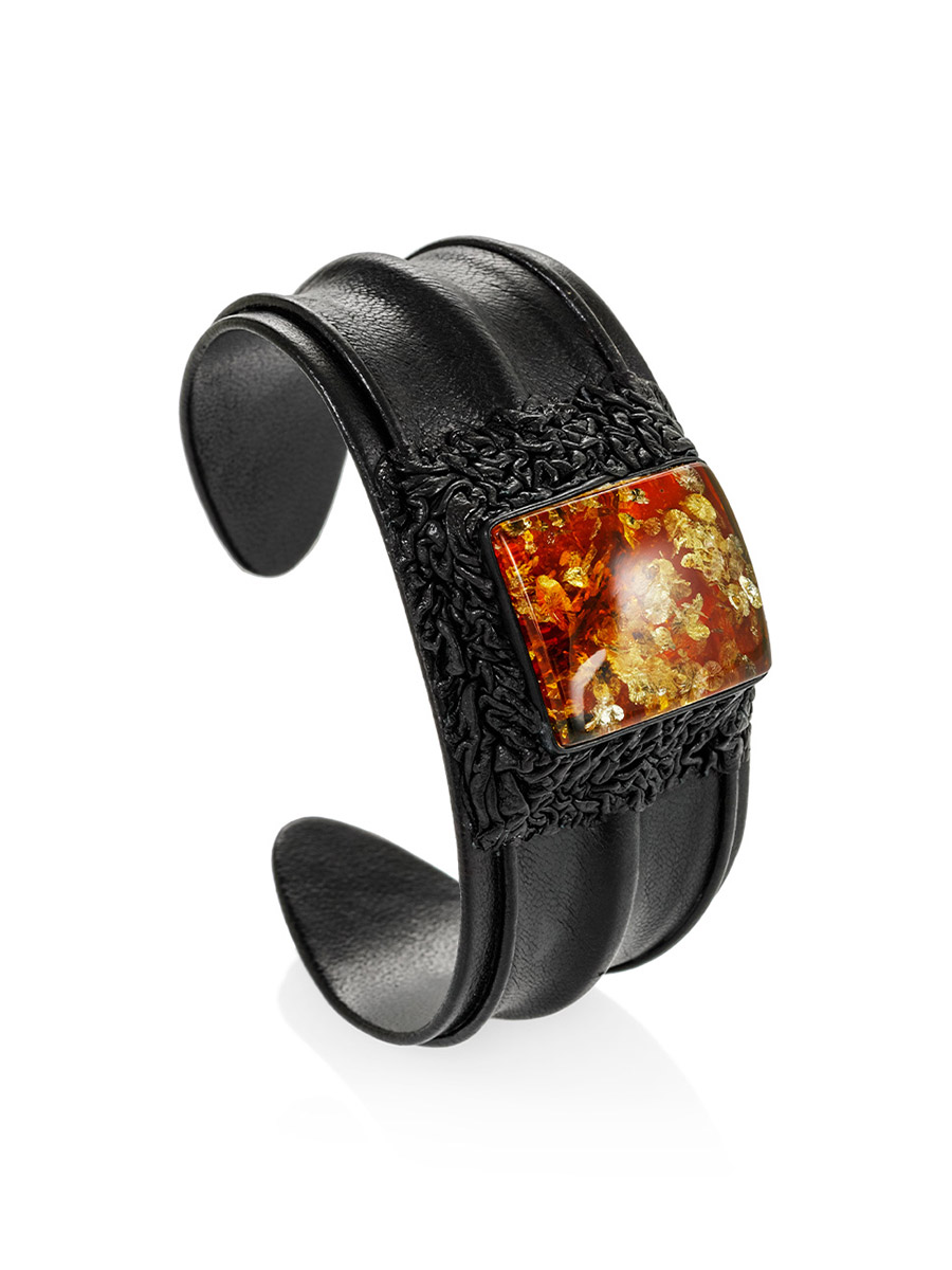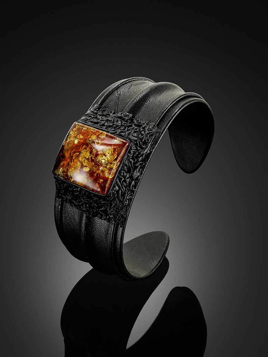 Эффектный браслет из натуральной кожи и искрящегося янтаря «Нефертити»
