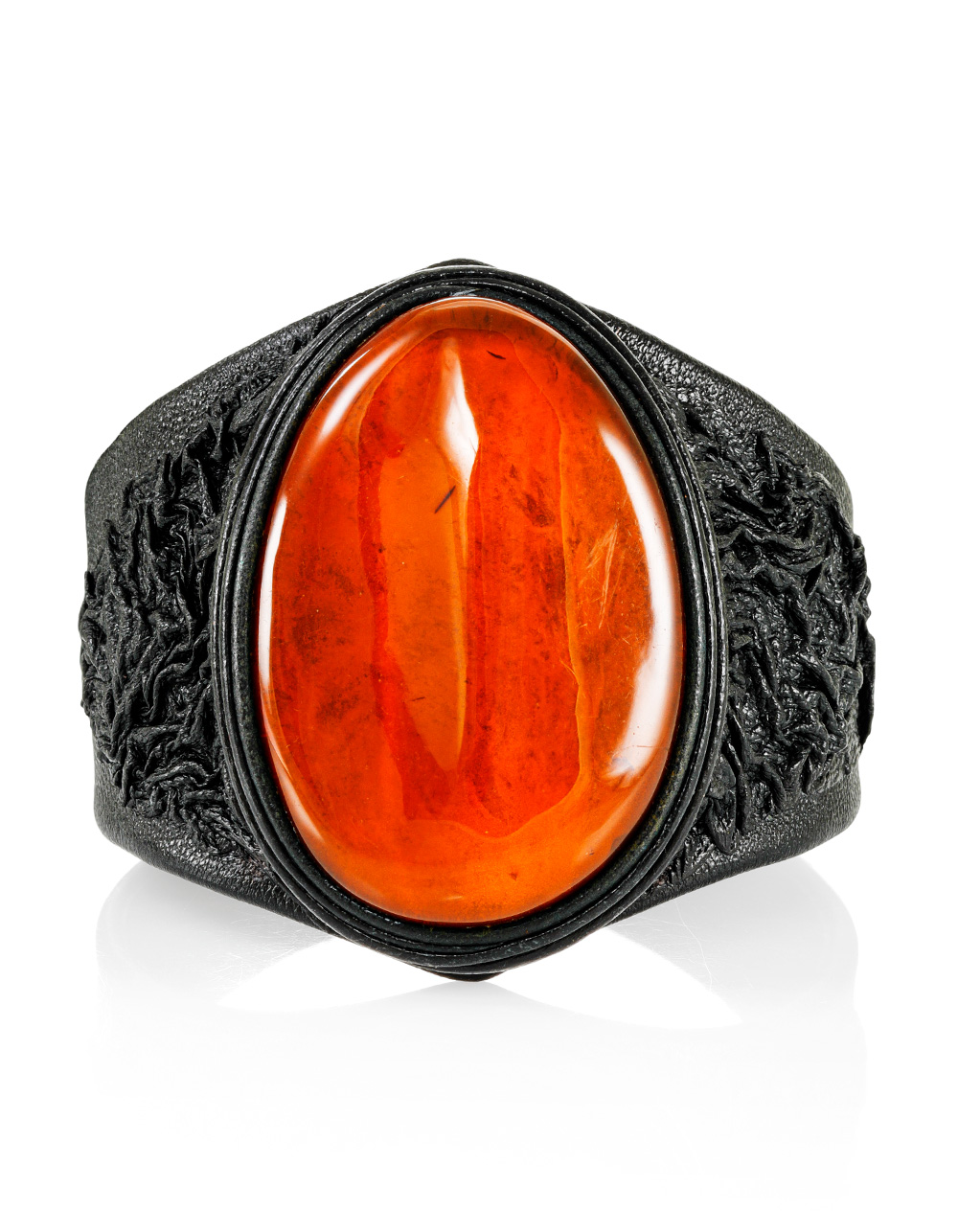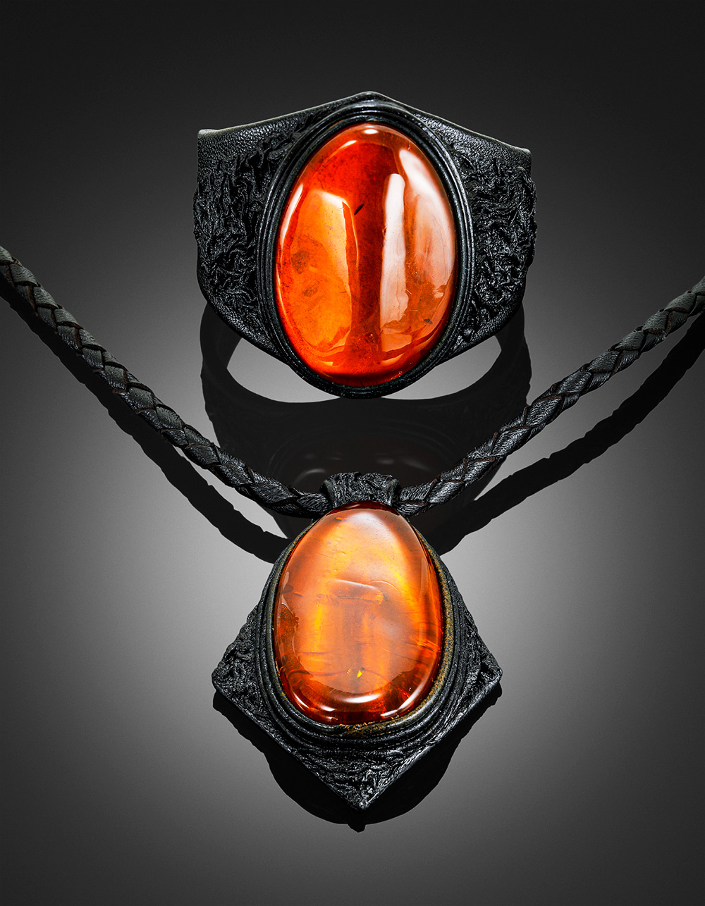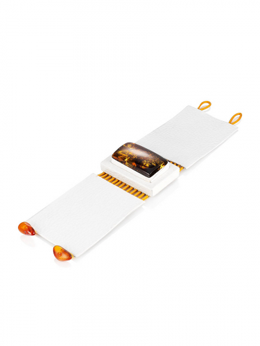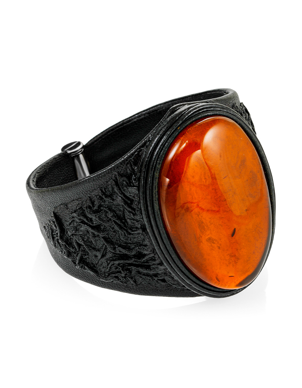 Эффектный браслет из натуральной кожи и яркого коньячного янтаря «Амазонка»