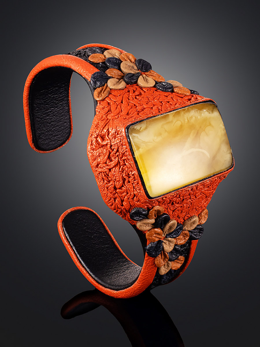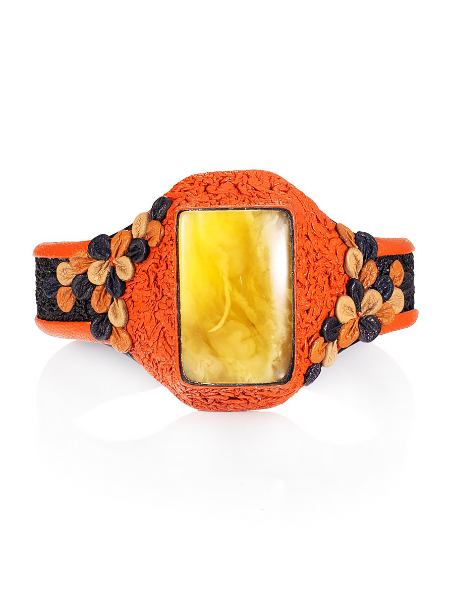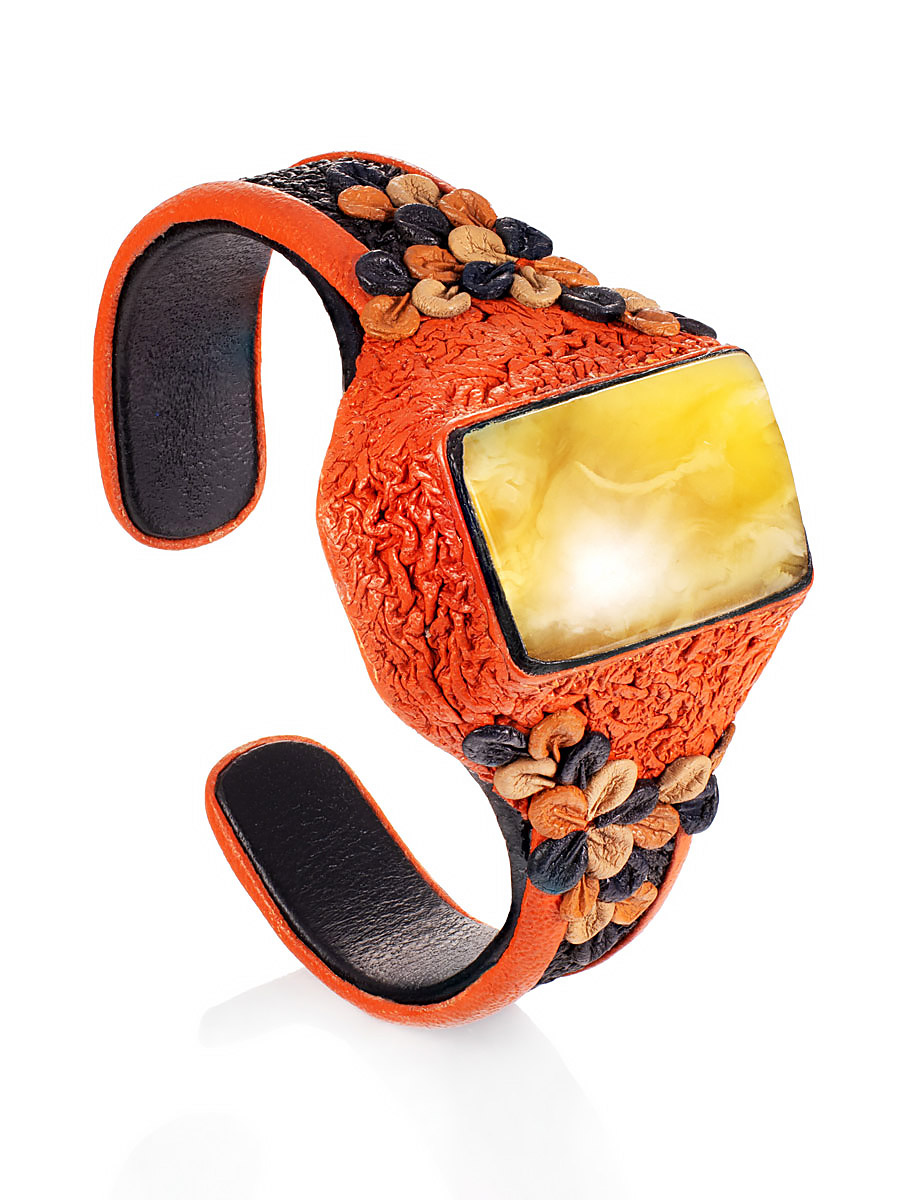 Эффектный браслет-манжета из натуральной кожи с пейзажным янтарём «Нефертити»