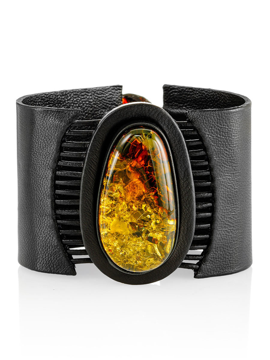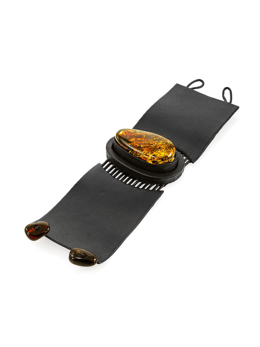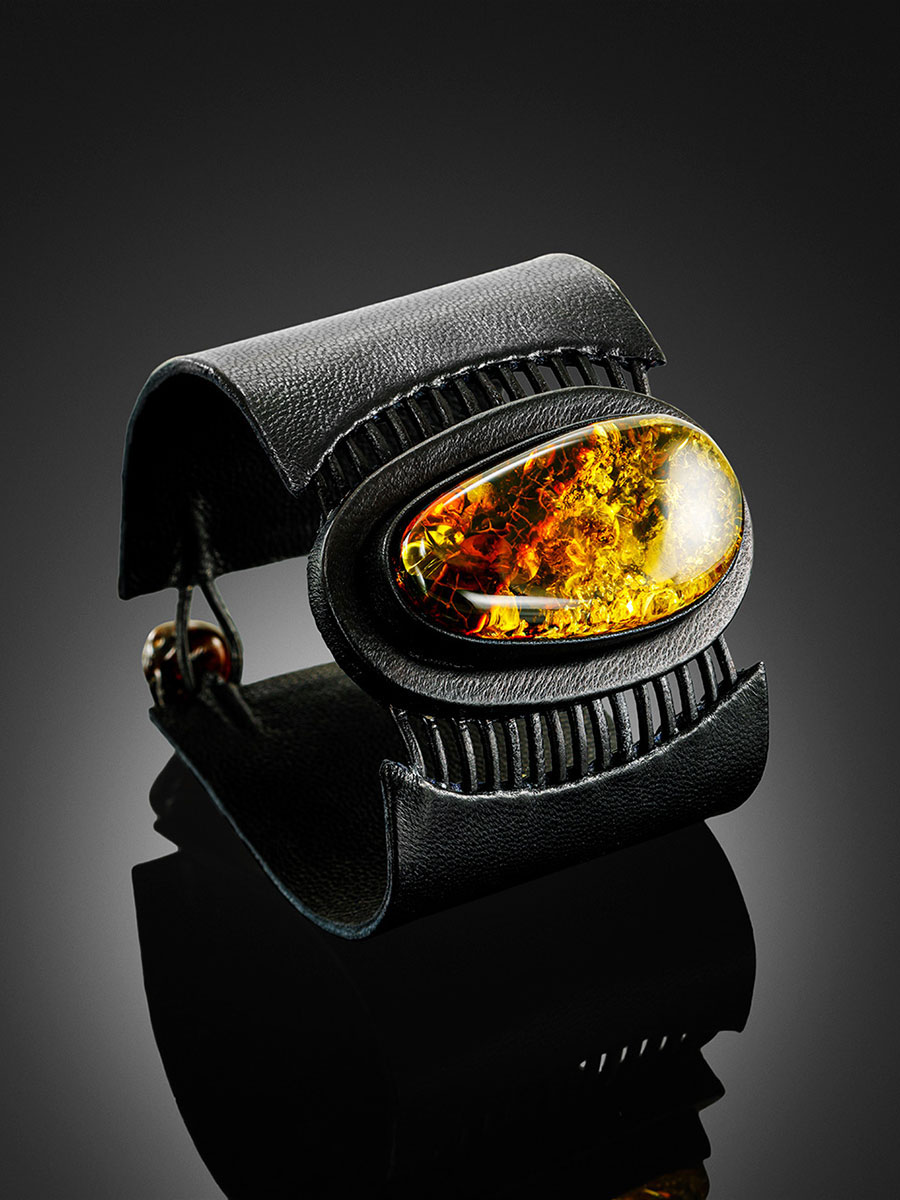 Эффектный кожаный браслет с цельным искрящимся янтарём «Амазонка»