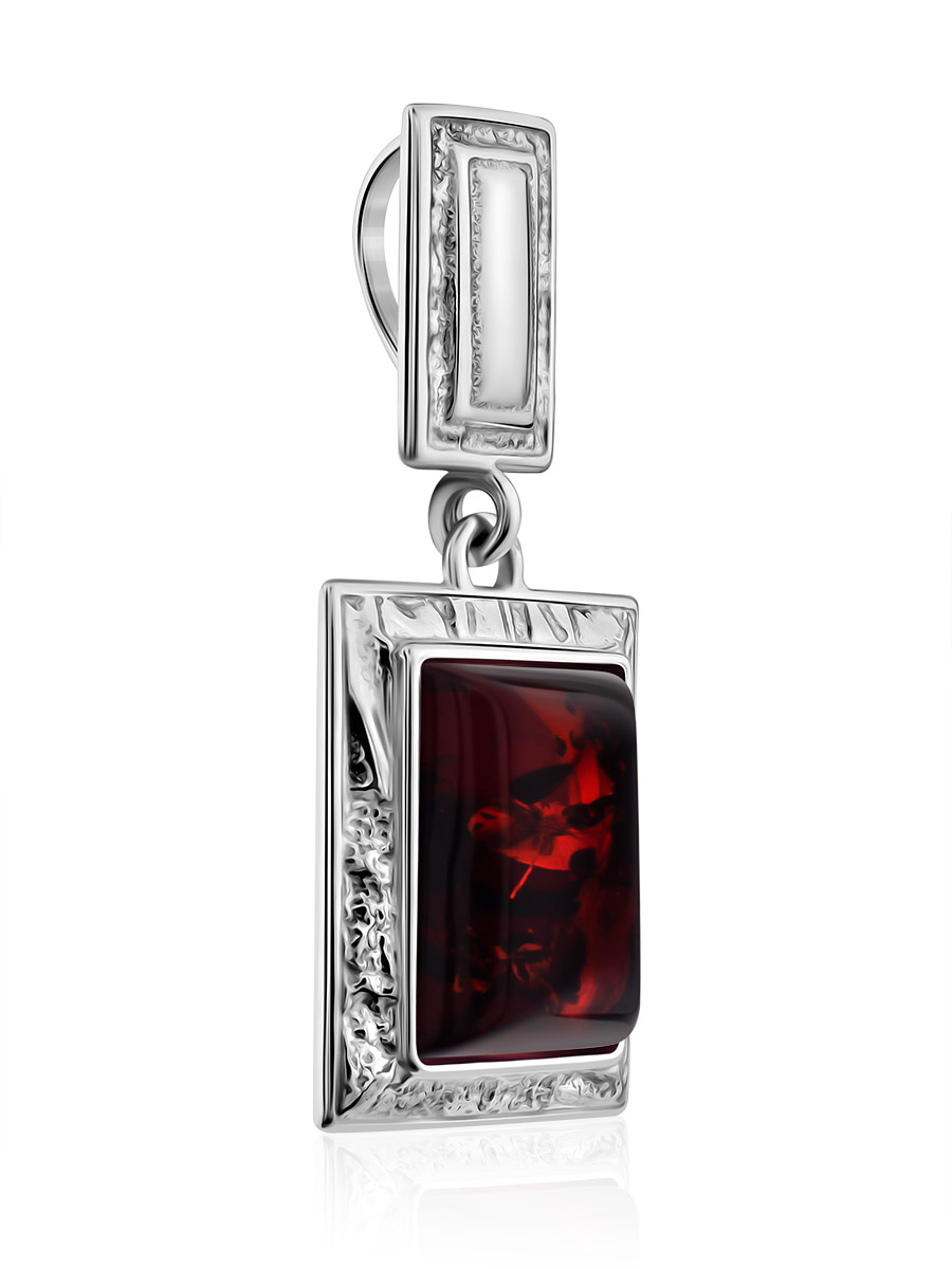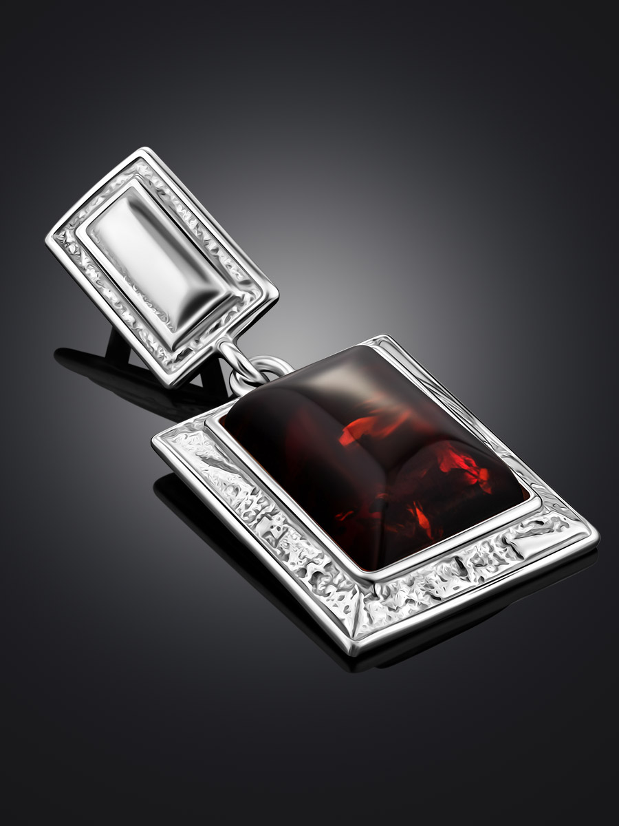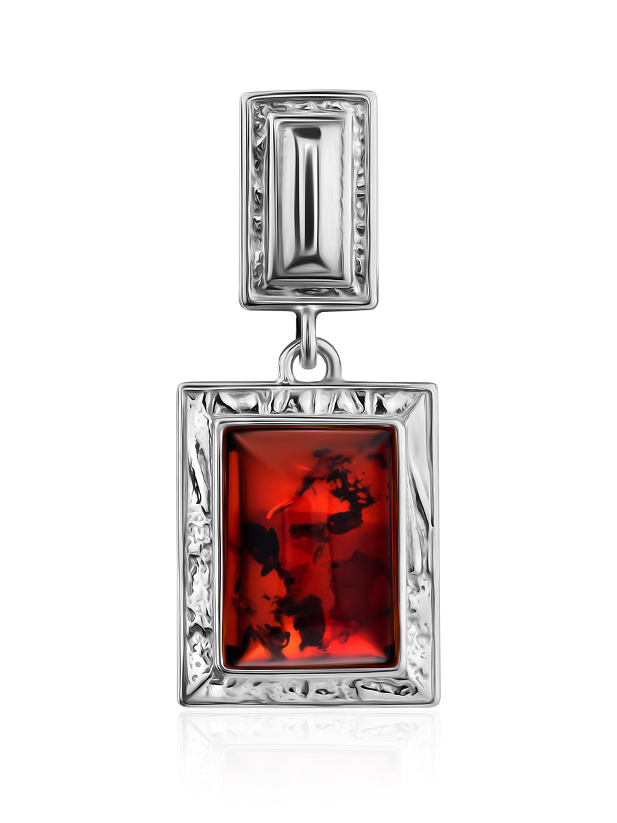 Изящная оправа этого кулона прямоугольной формы создана из серебра 925 пробы и обрамляет крупную вставку из натурального балтийского янтаря красивого вишнёвого цвета. Это украшение, бесспорно, станет яркой деталью вашего образа, добавив в облик нотку элегантной роскоши. Подвеску можно носить на цепочке или ленте, создавая различные образы. _x000D_
