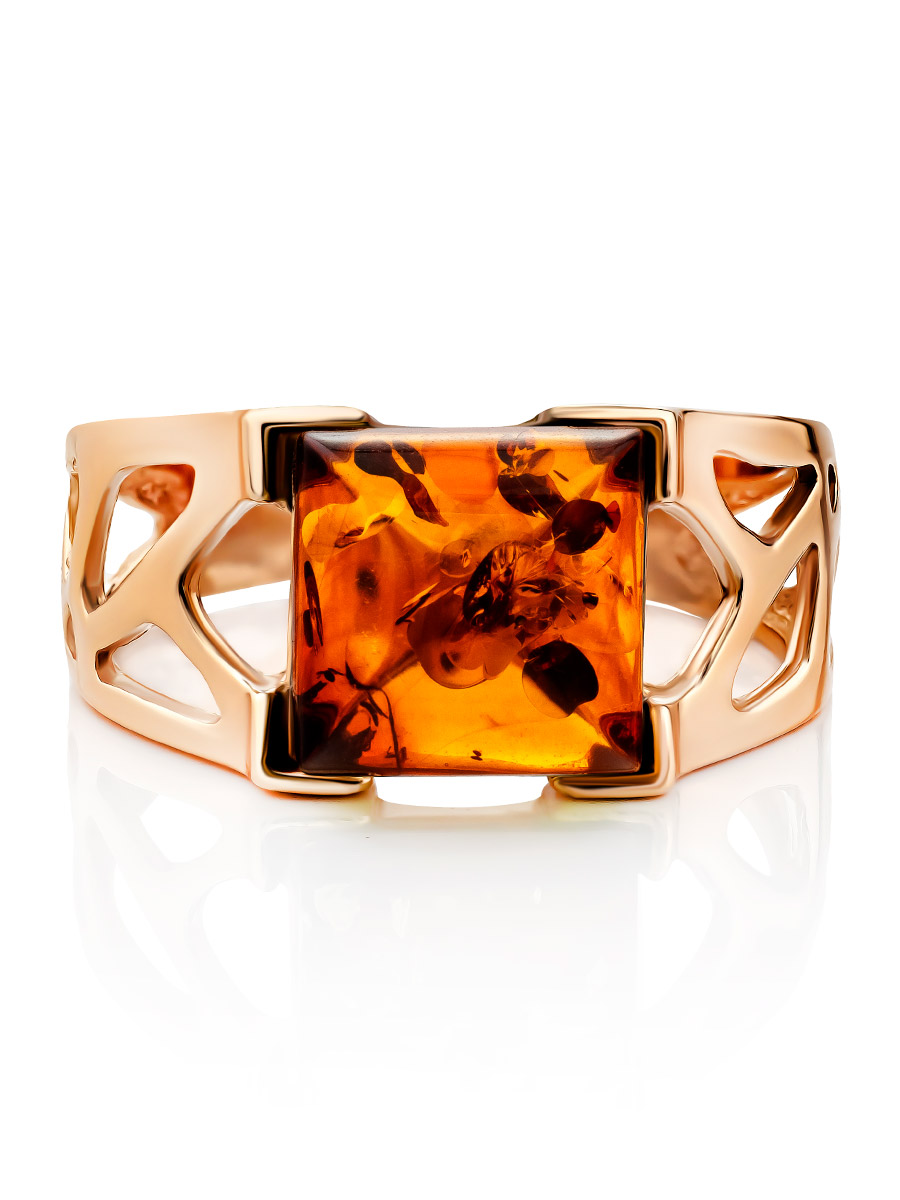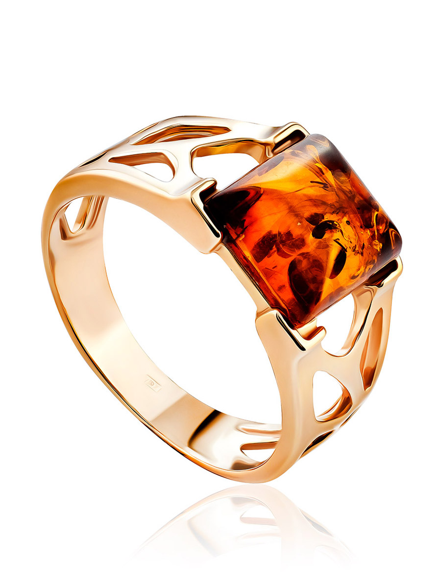 Эффектный перстень из золочёного серебра с натуральным янтарём «Артемида»