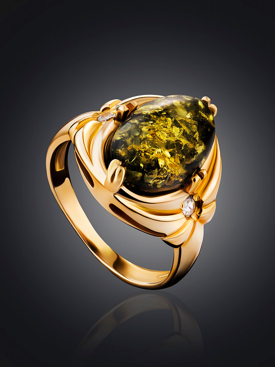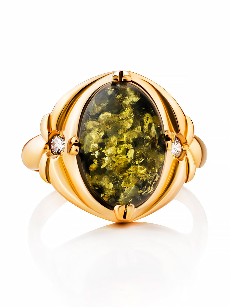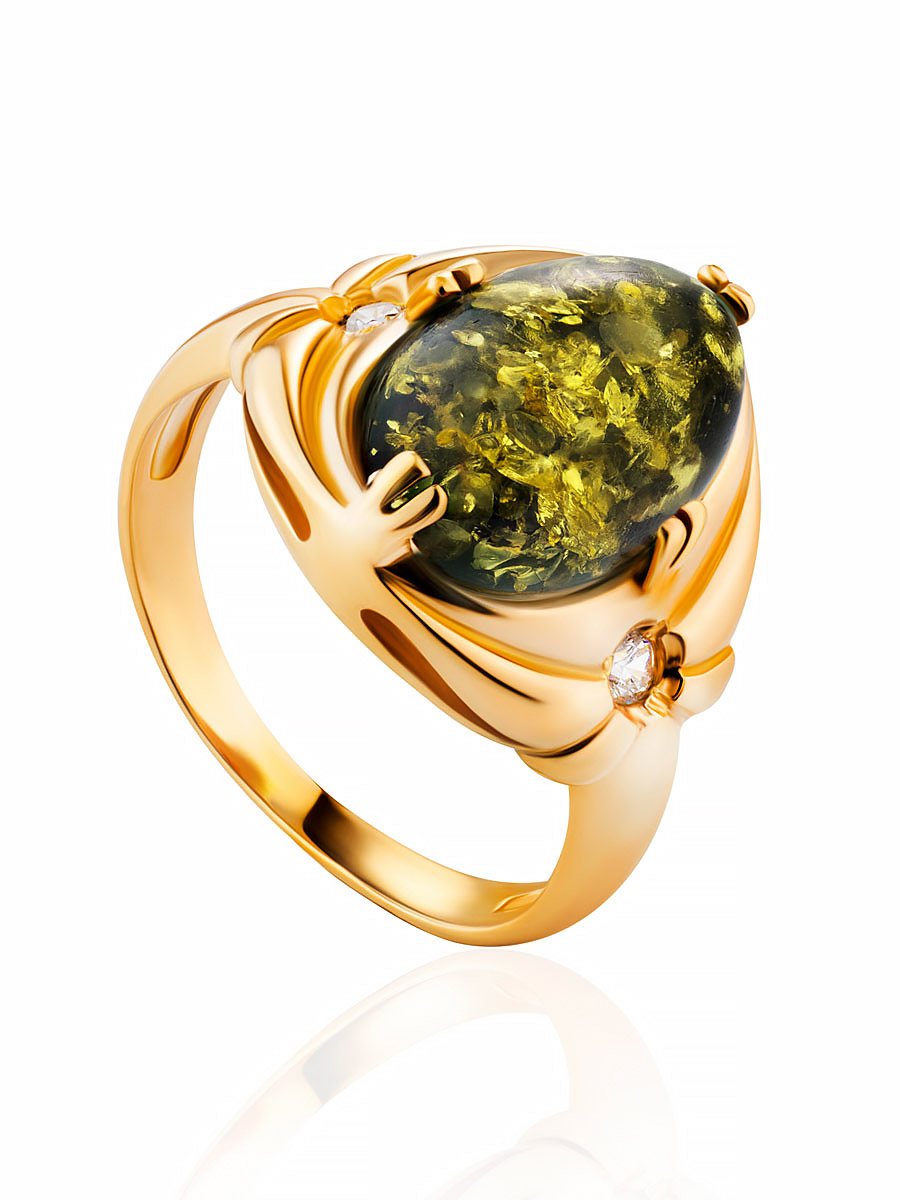 Элегантное позолоченное кольцо с натуральным зелёным янтарём «Альбертина»