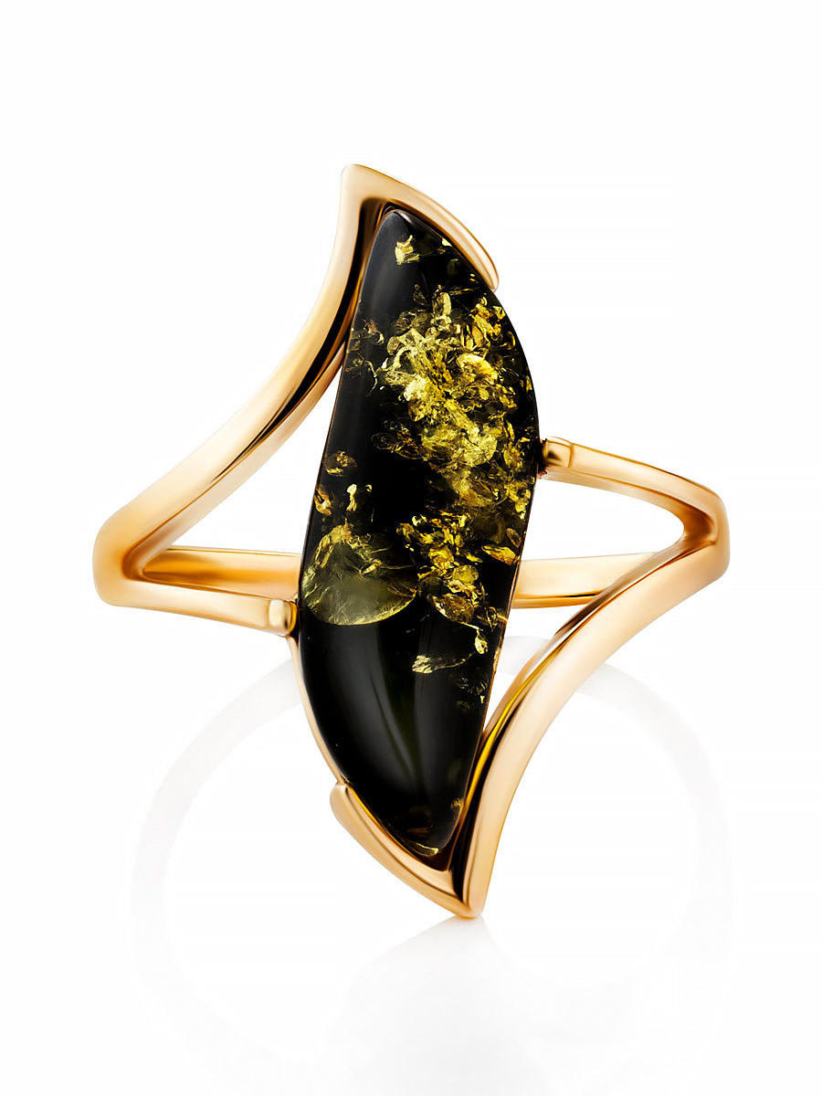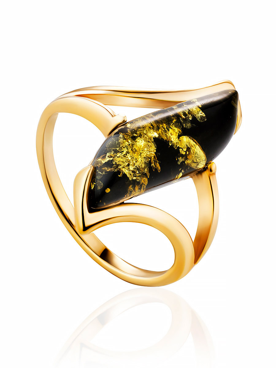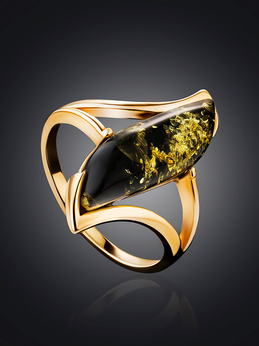 Элегантное позолоченное кольцо «Веста» с натуральным балтийским янтарём зелёного цвета